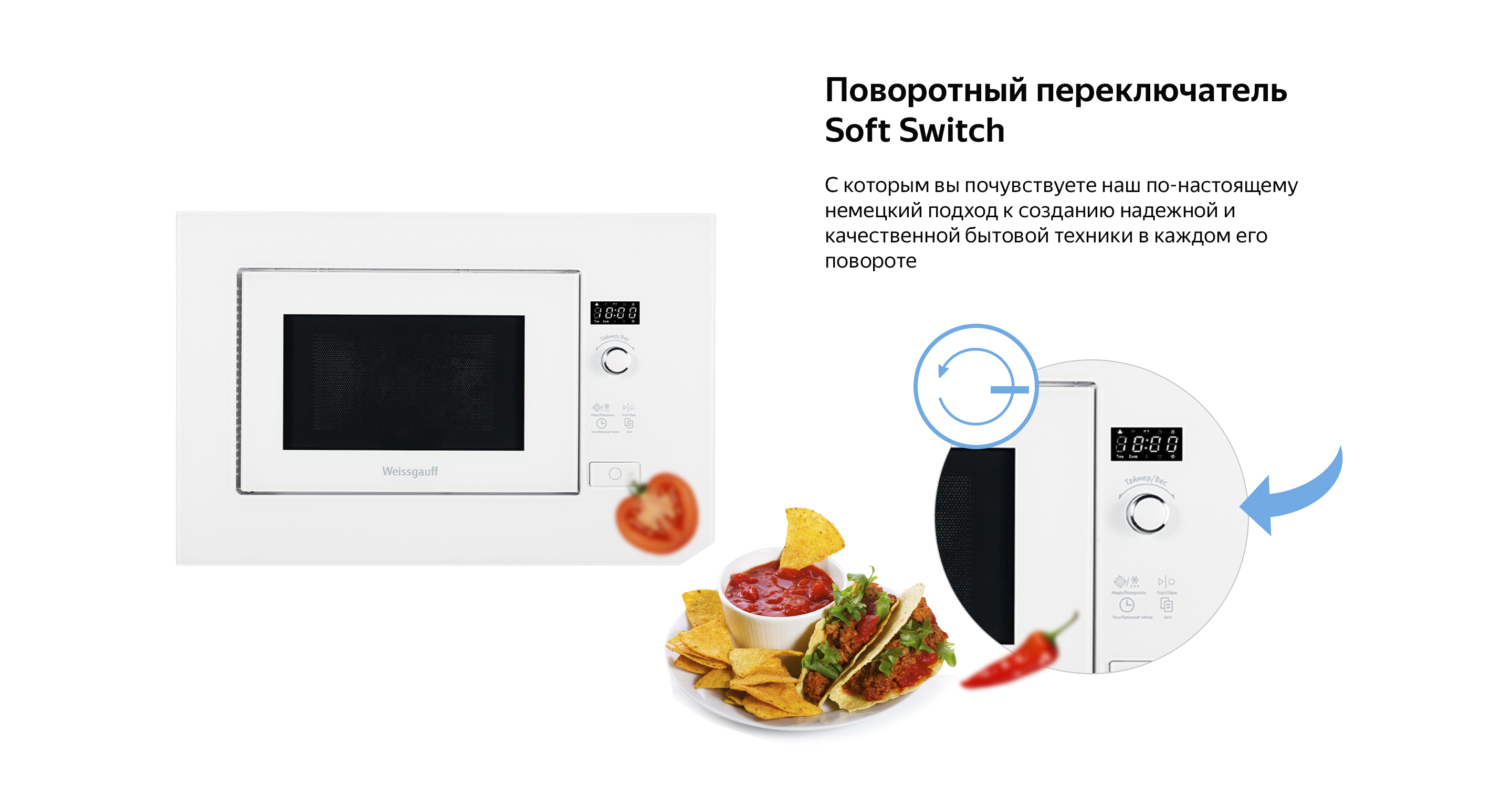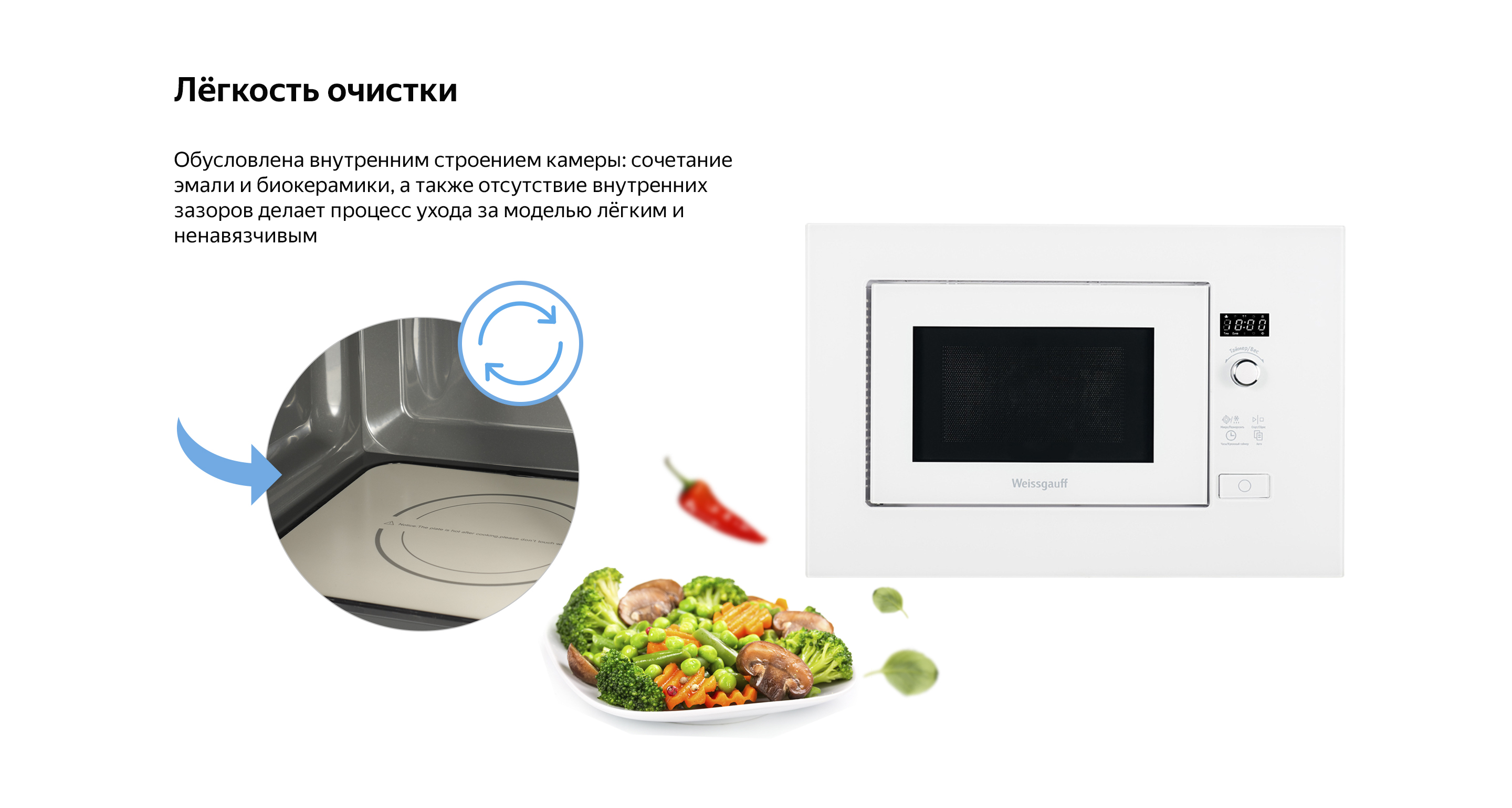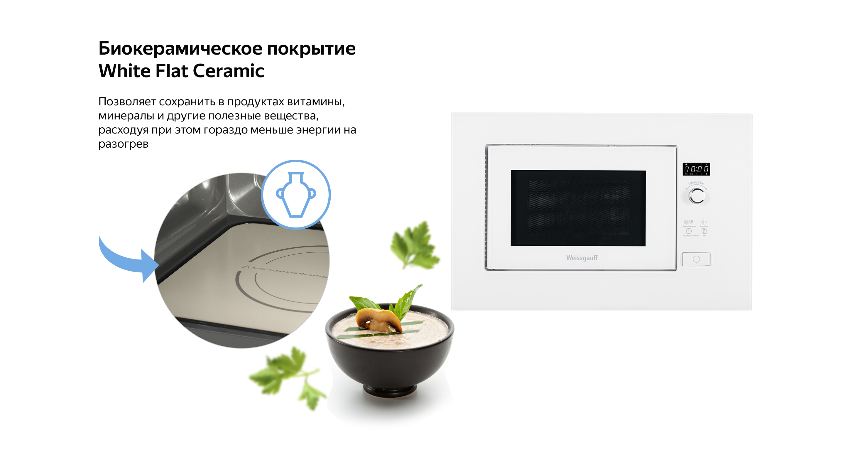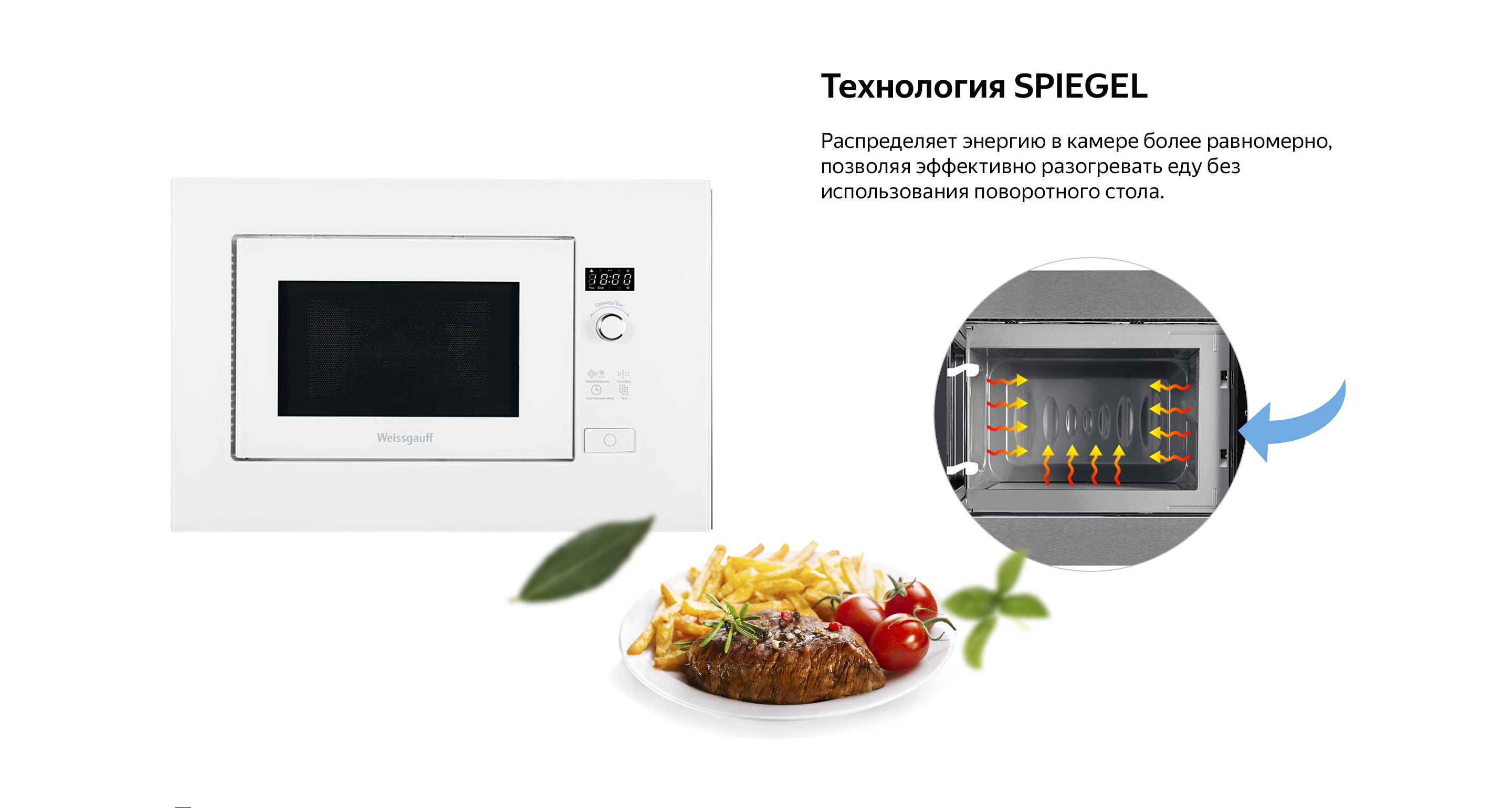Встраиваемая микроволновая печь Weissgauff в белом цвете равномерно разогревает еду без поворотного стола, благодаря системе Spiegel и биокерамическому покрытию White Flat Ceramic.