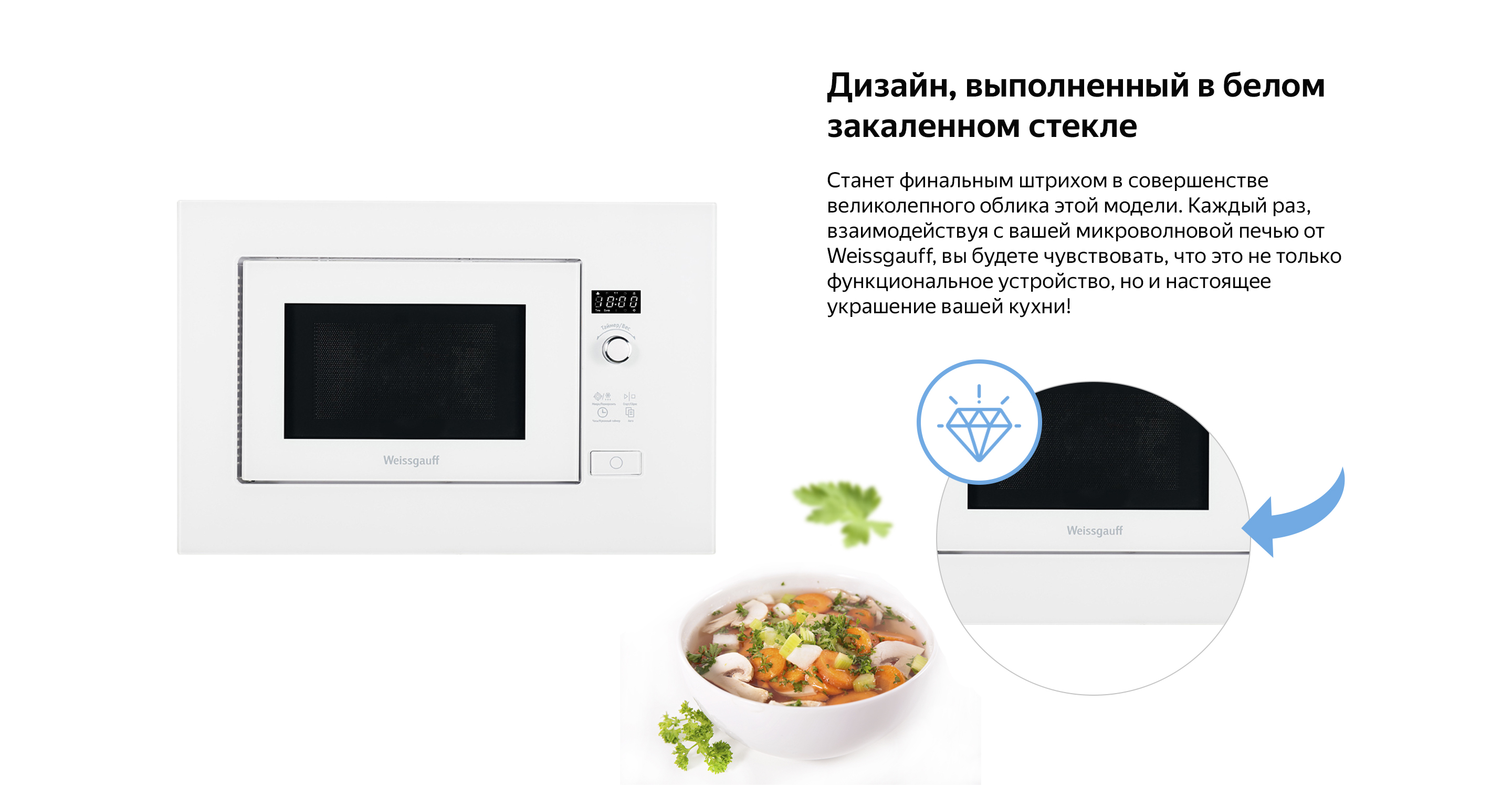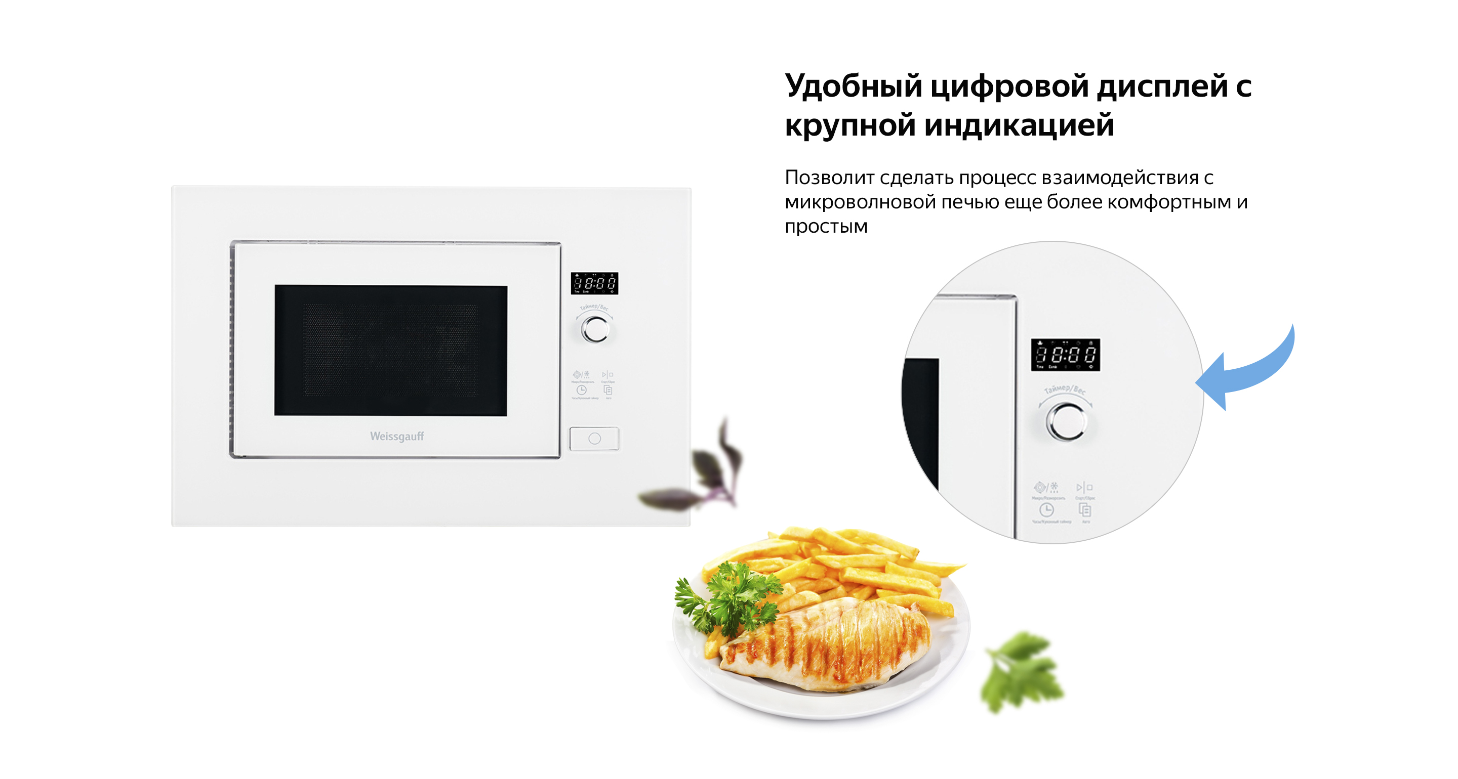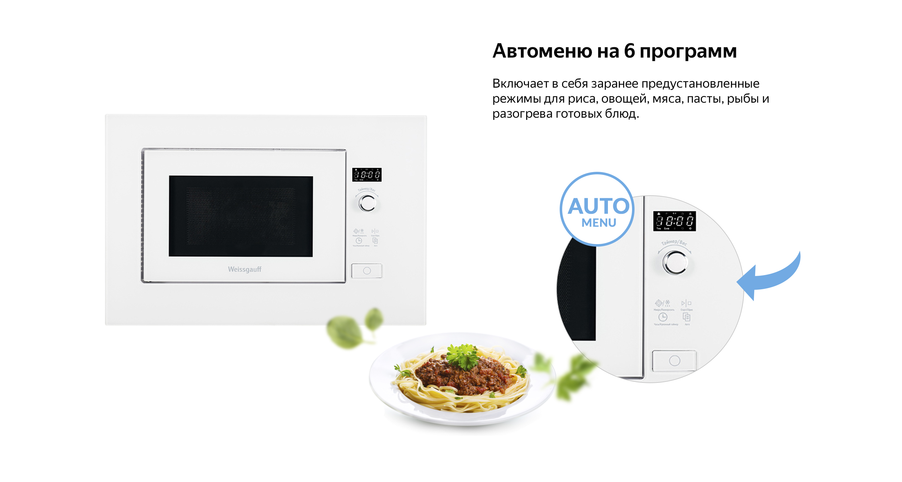Встраиваемая микроволновая печь Weissgauff в белом цвете равномерно разогревает еду без поворотного стола, благодаря системе Spiegel и биокерамическому покрытию White Flat Ceramic.