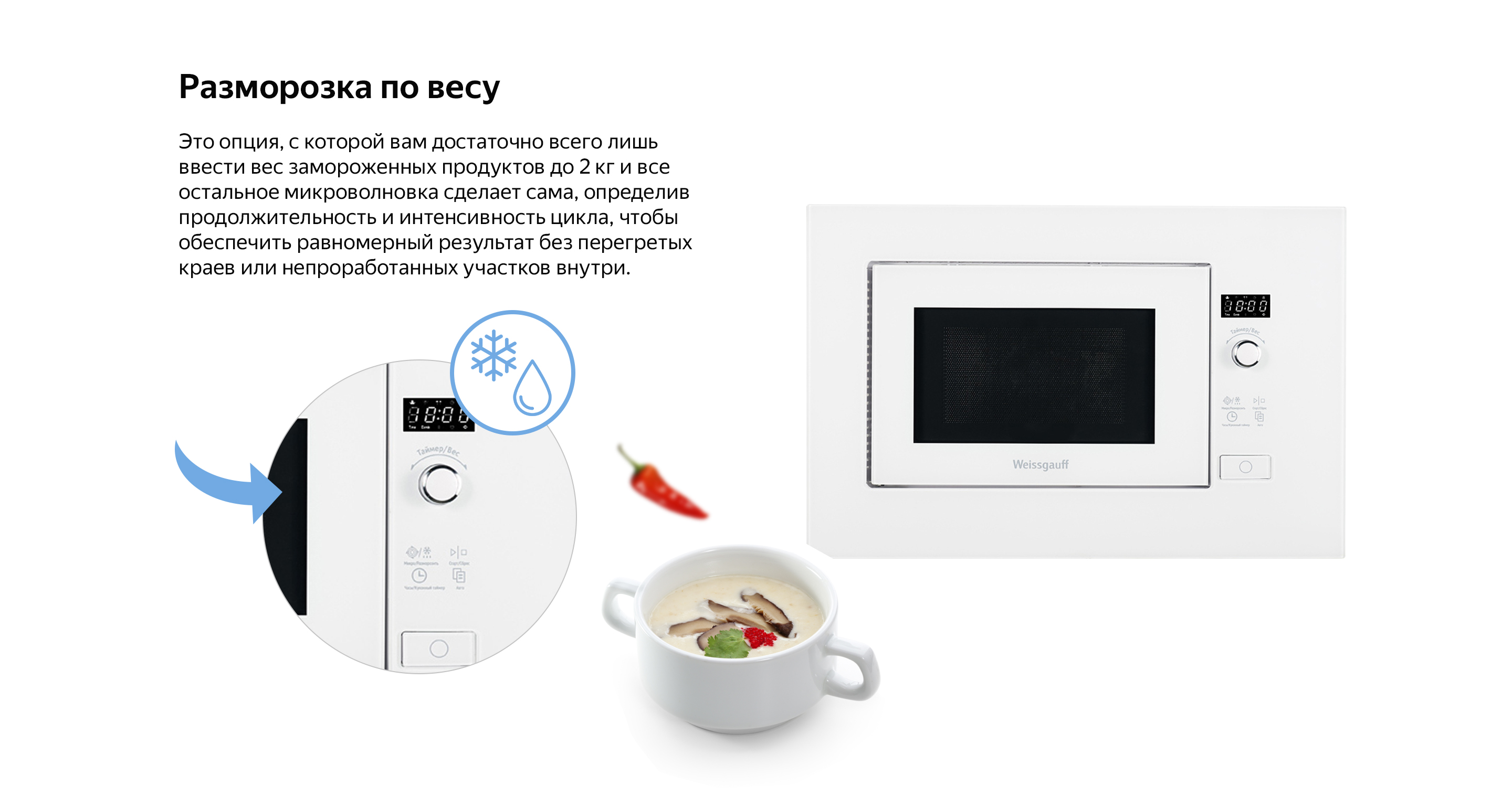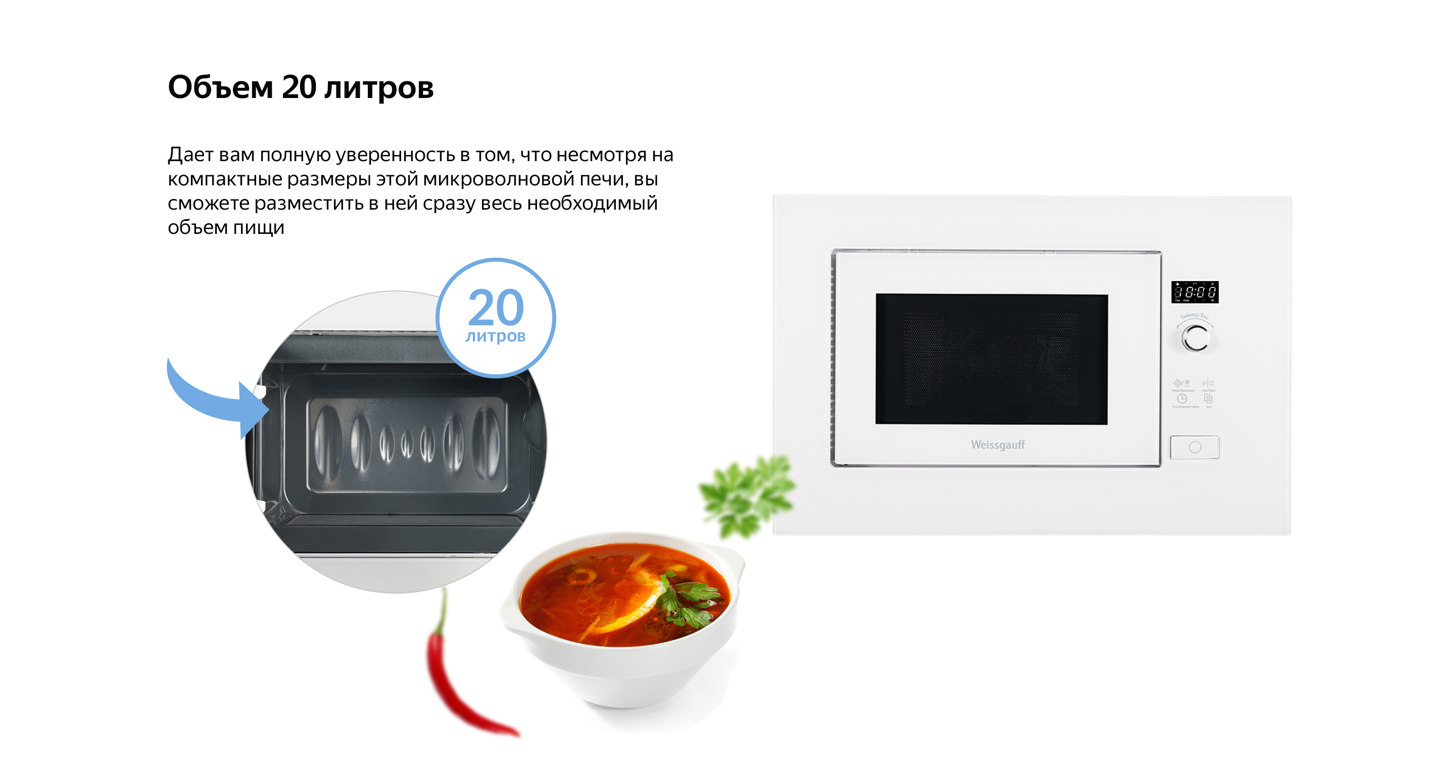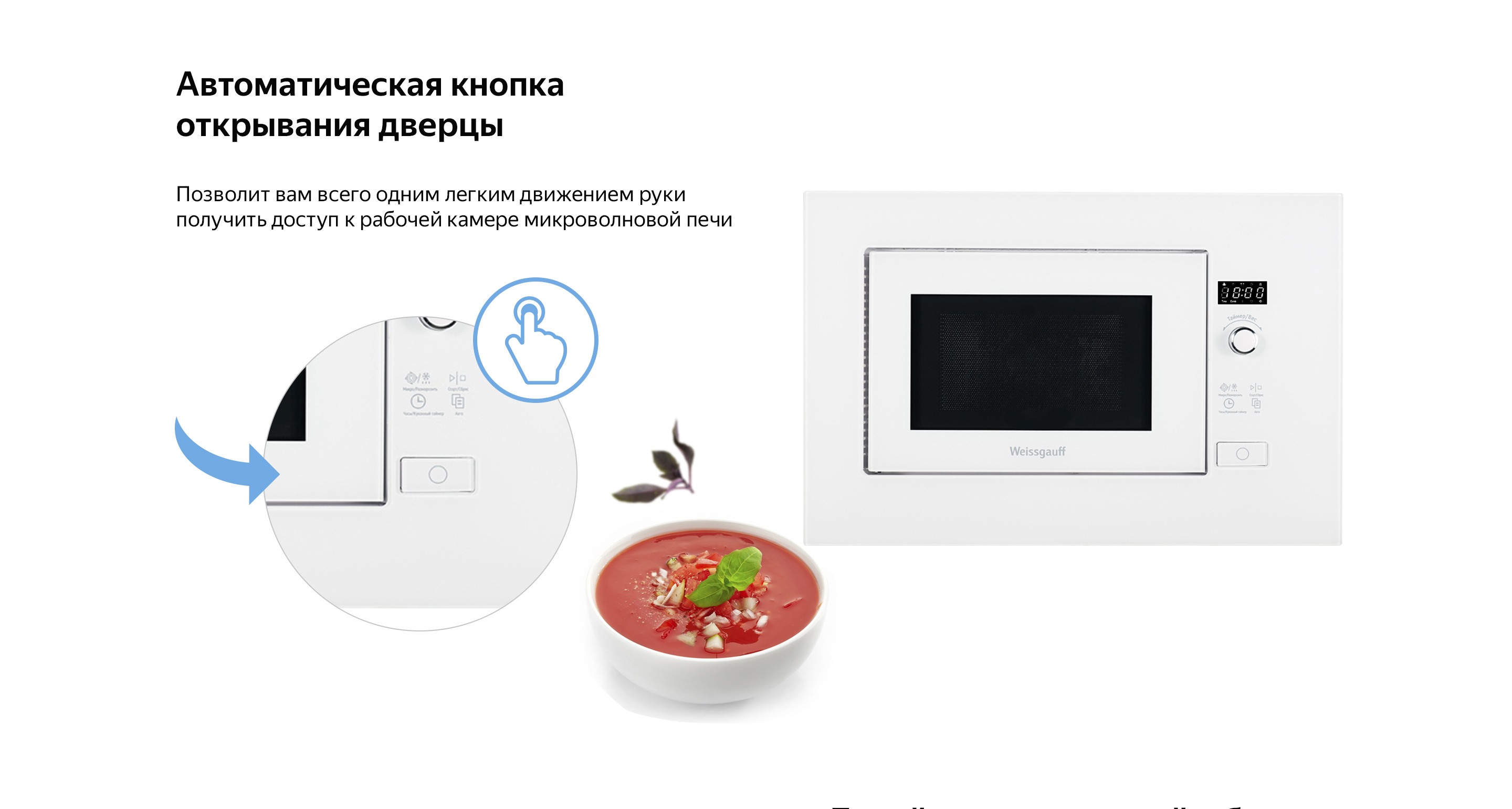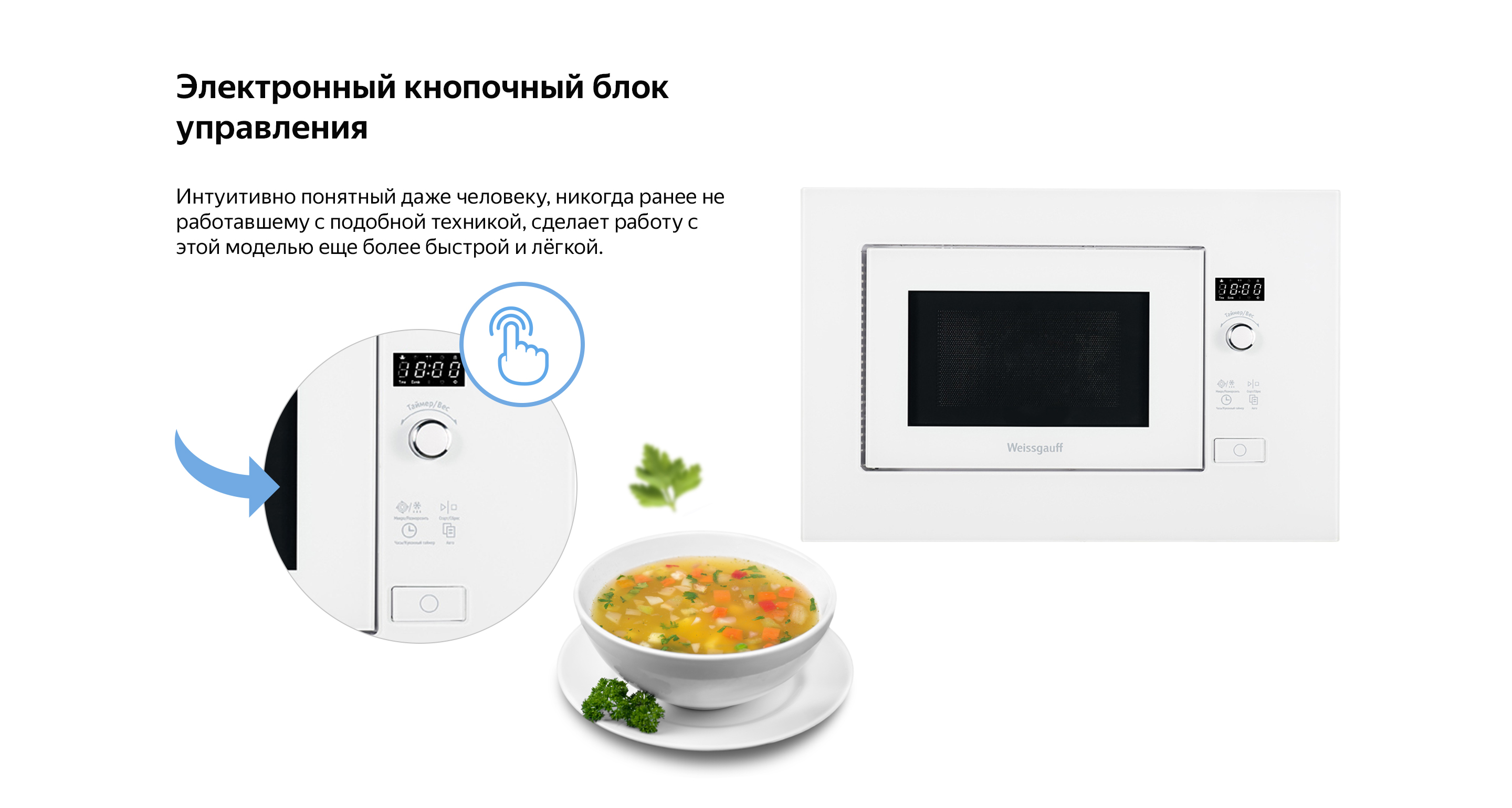 Встраиваемая микроволновая печь Weissgauff в белом цвете равномерно разогревает еду без поворотного стола, благодаря системе Spiegel и биокерамическому покрытию White Flat Ceramic.