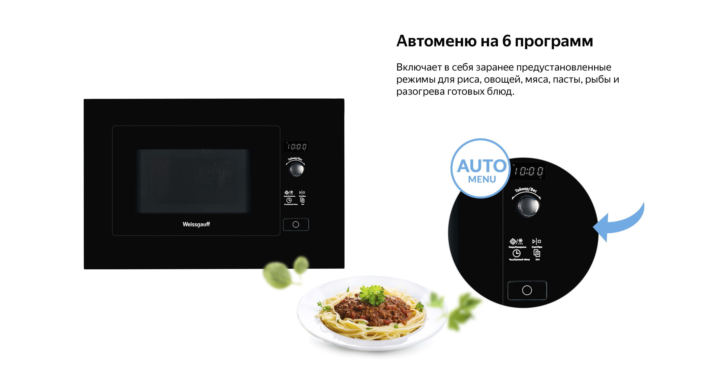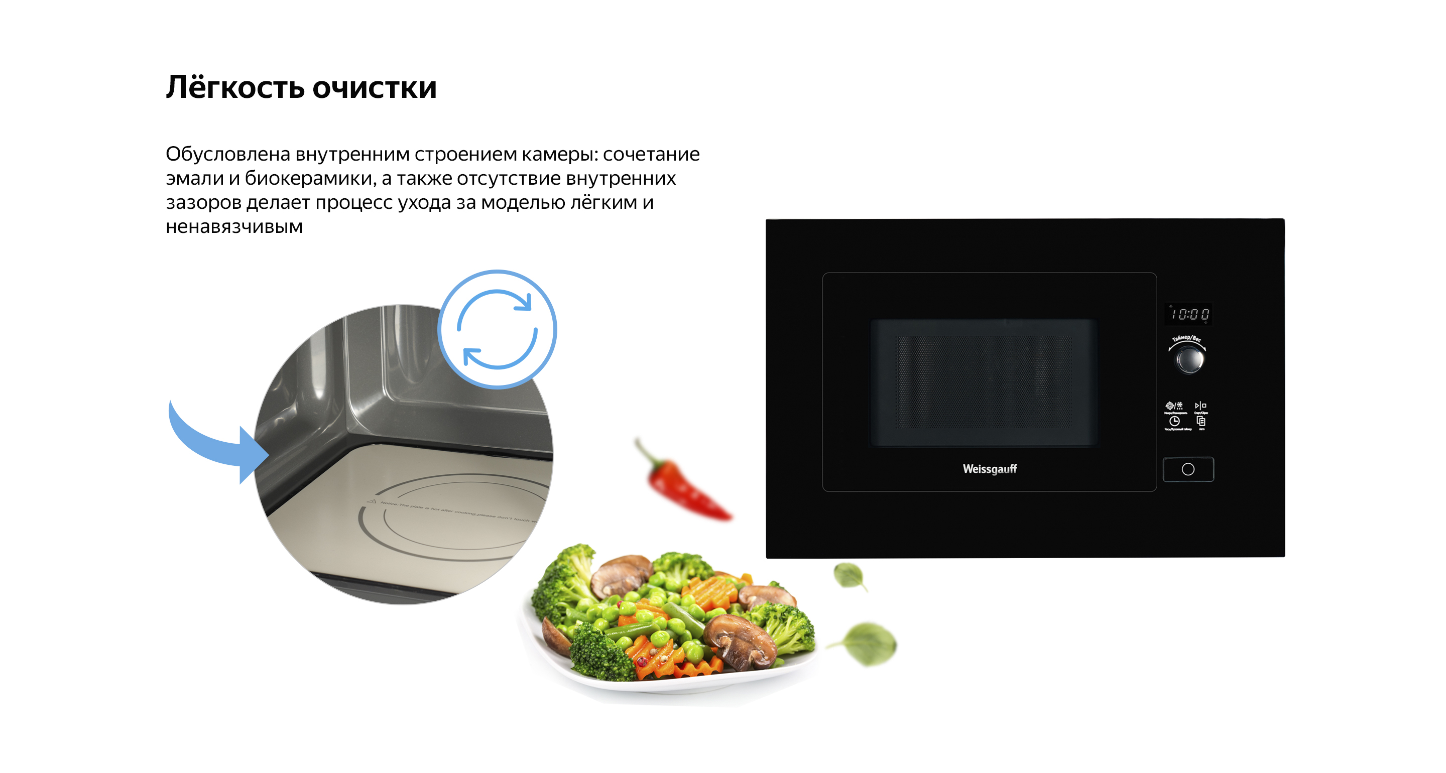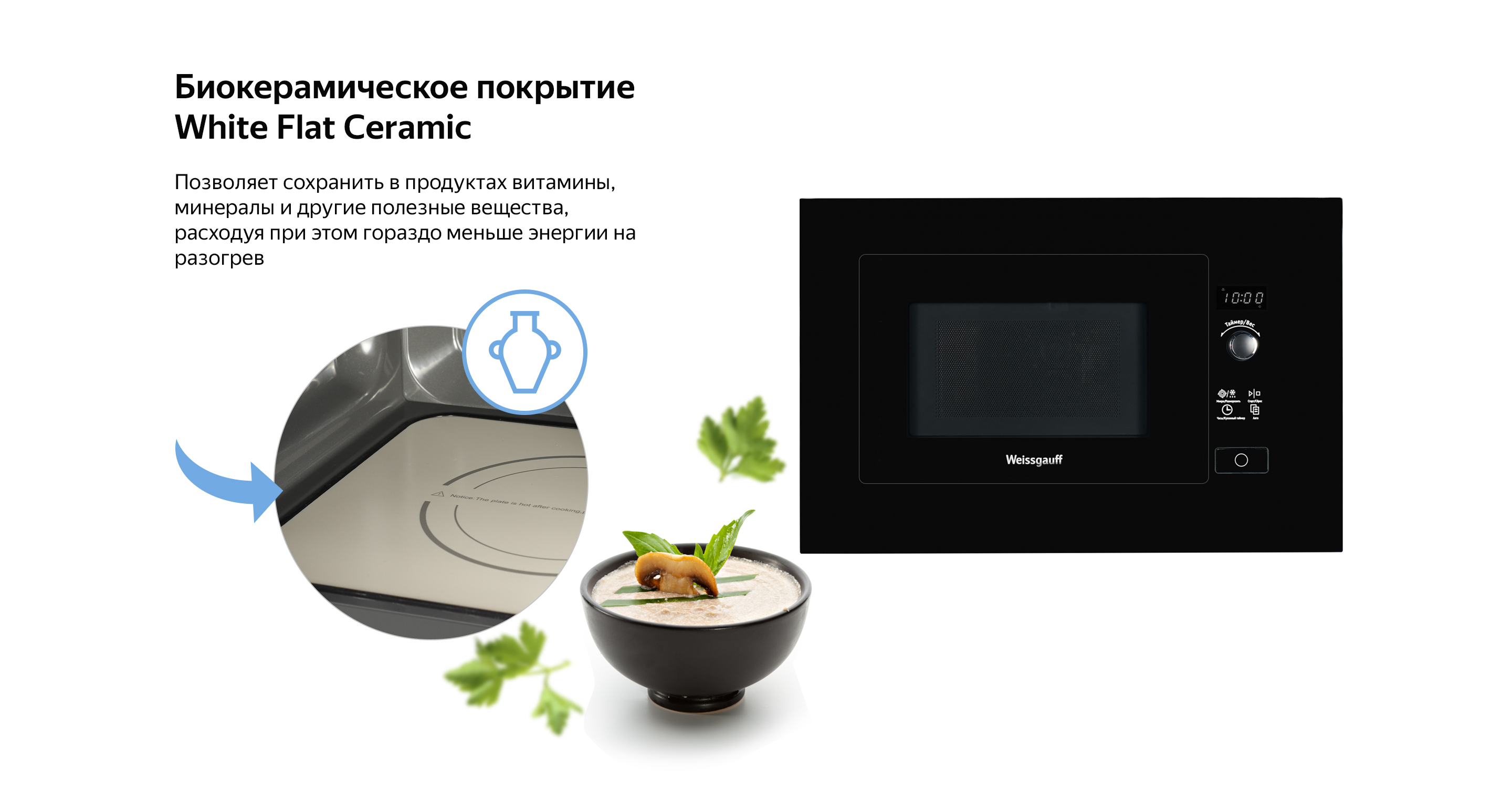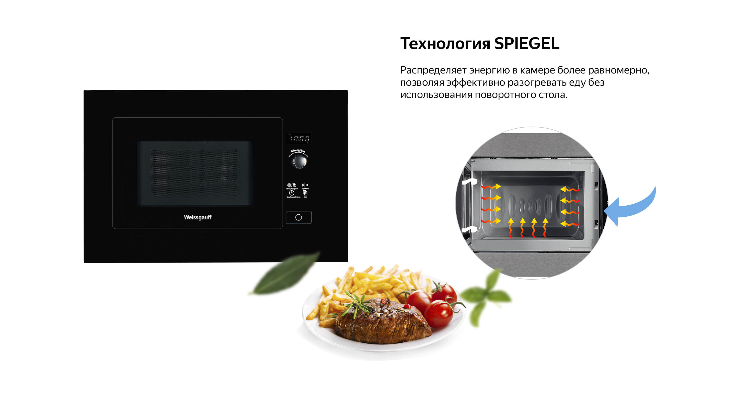 Встраиваемая микроволновая печь Weissgauff в чёрном цвете равномерно разогревает еду без поворотного стола, благодаря системе Spiegel и биокерамическому покрытию White Flat Ceramic.