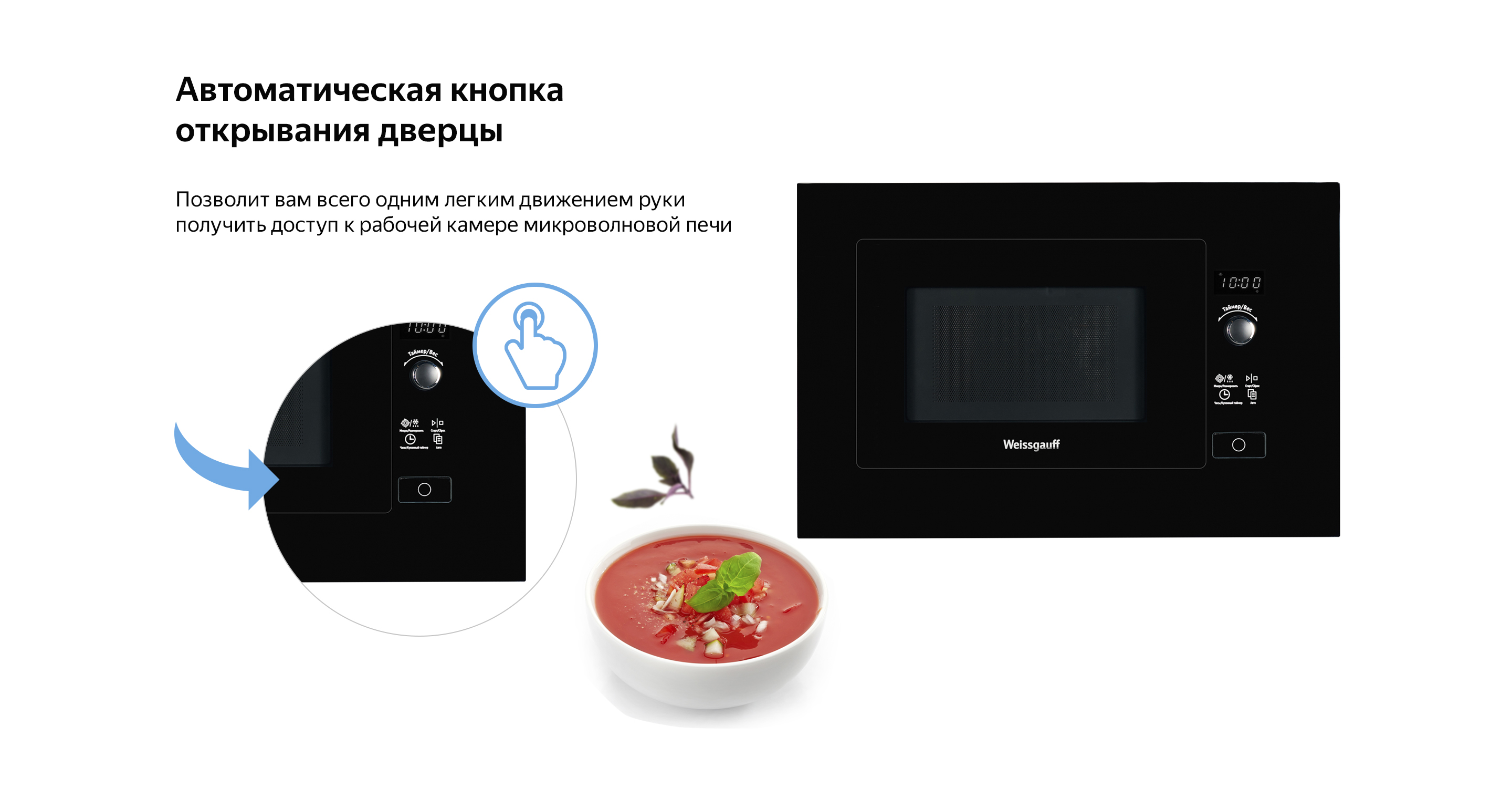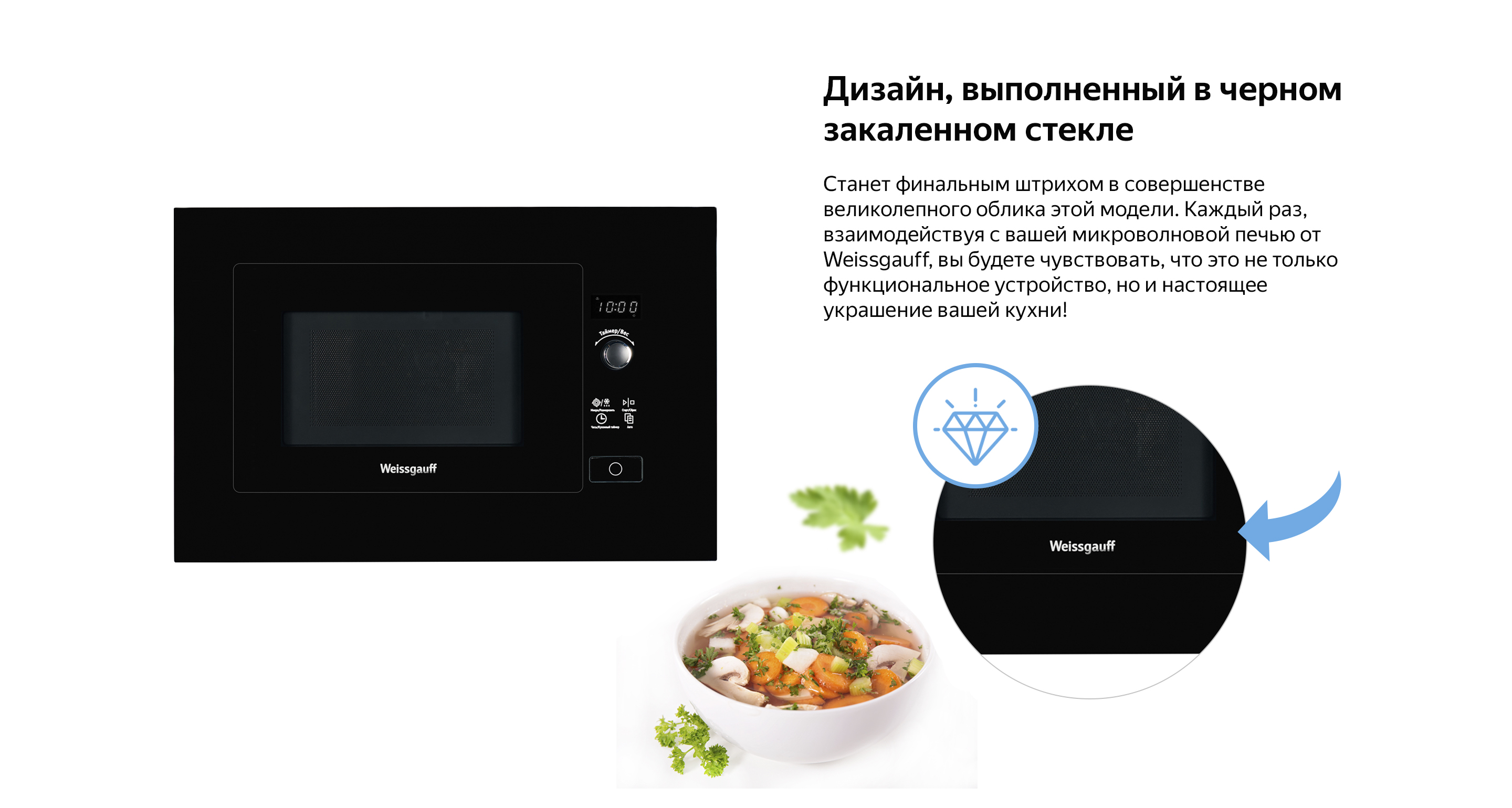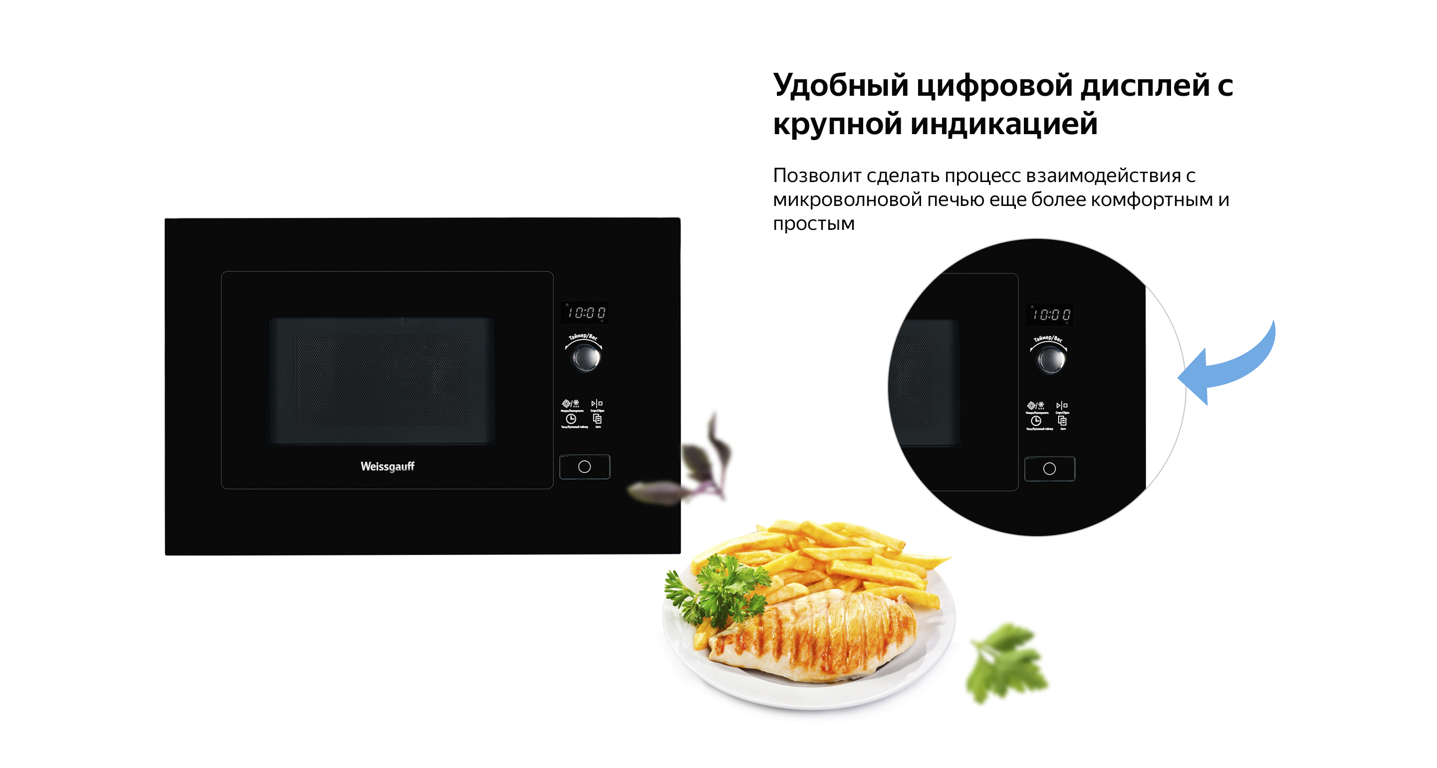 Встраиваемая микроволновая печь Weissgauff в чёрном цвете равномерно разогревает еду без поворотного стола, благодаря системе Spiegel и биокерамическому покрытию White Flat Ceramic.