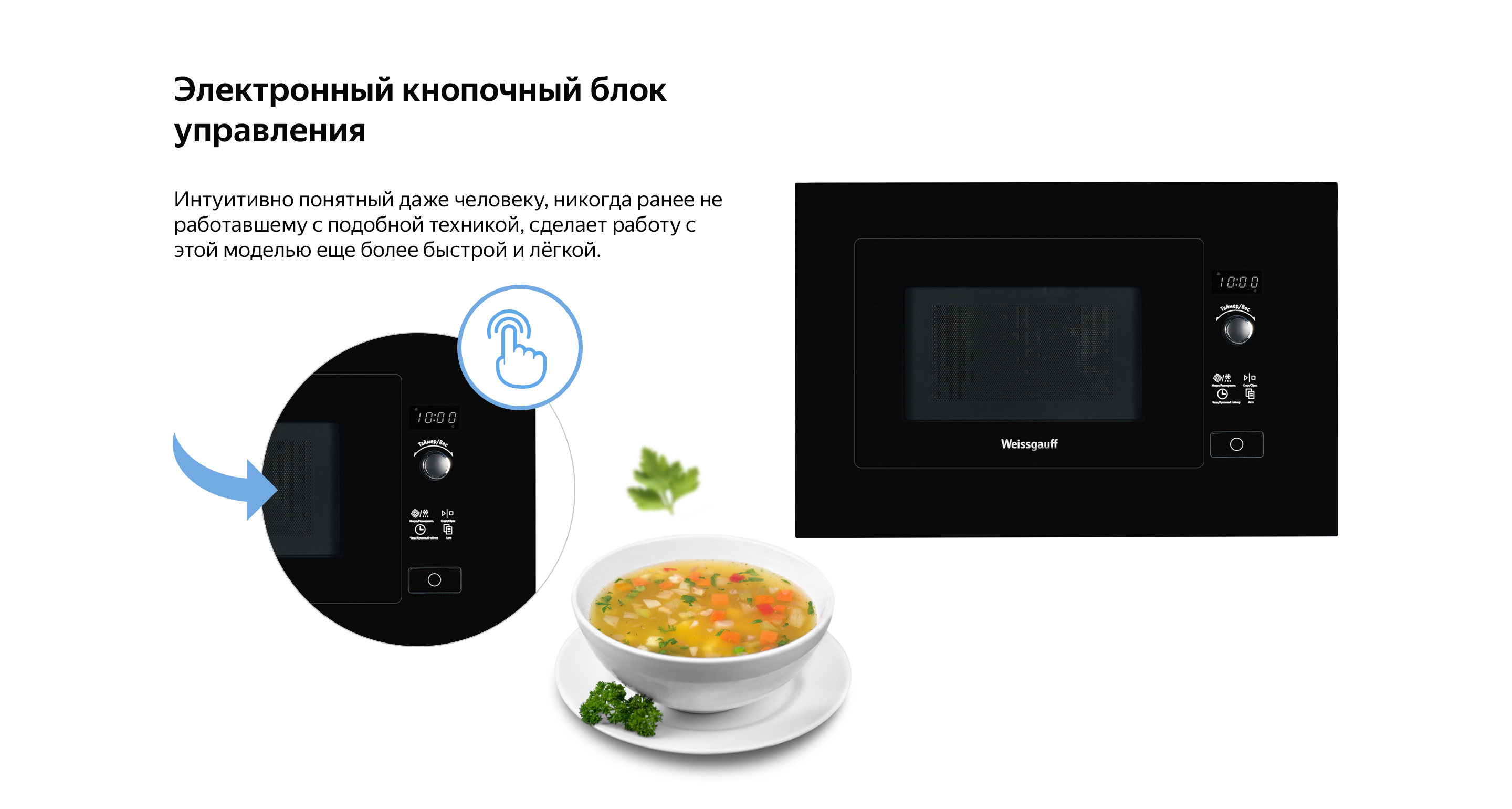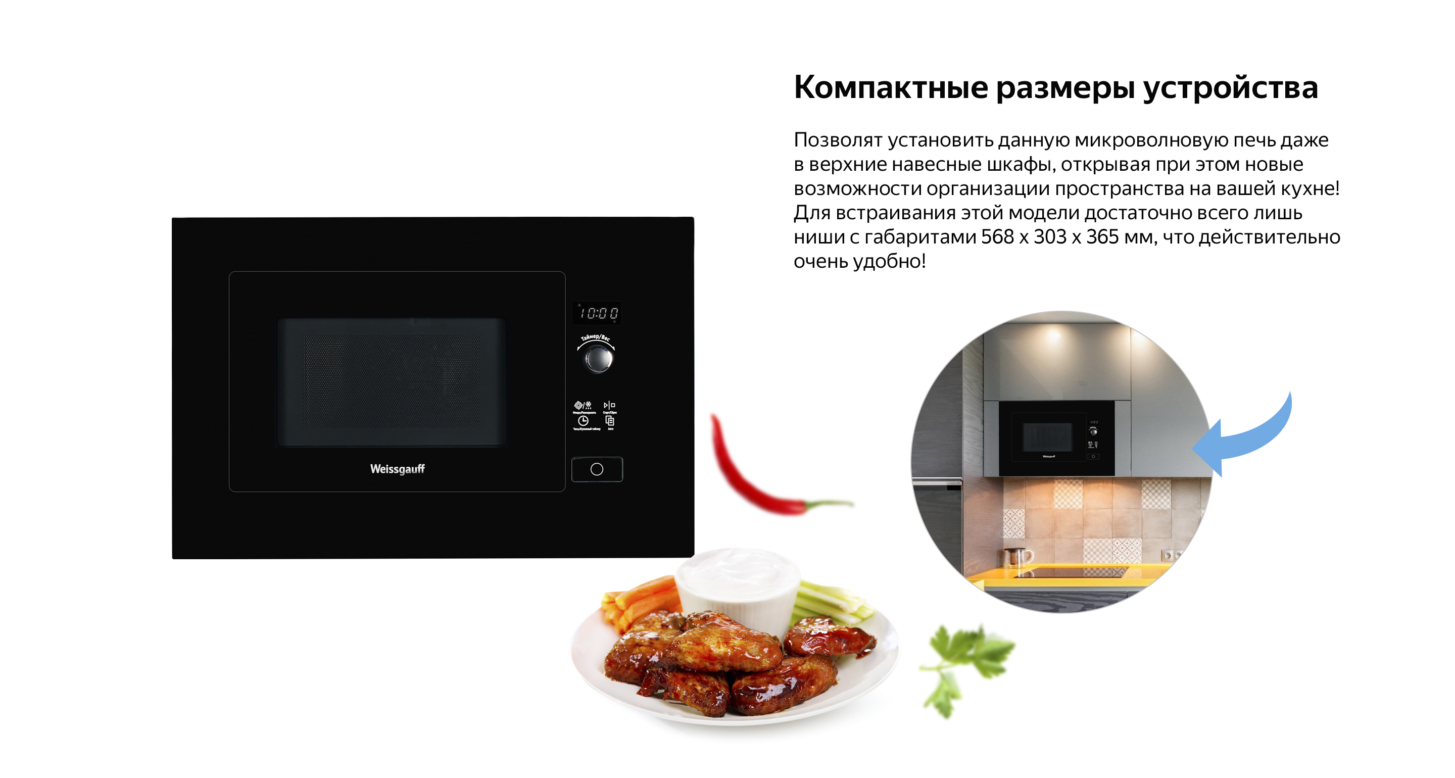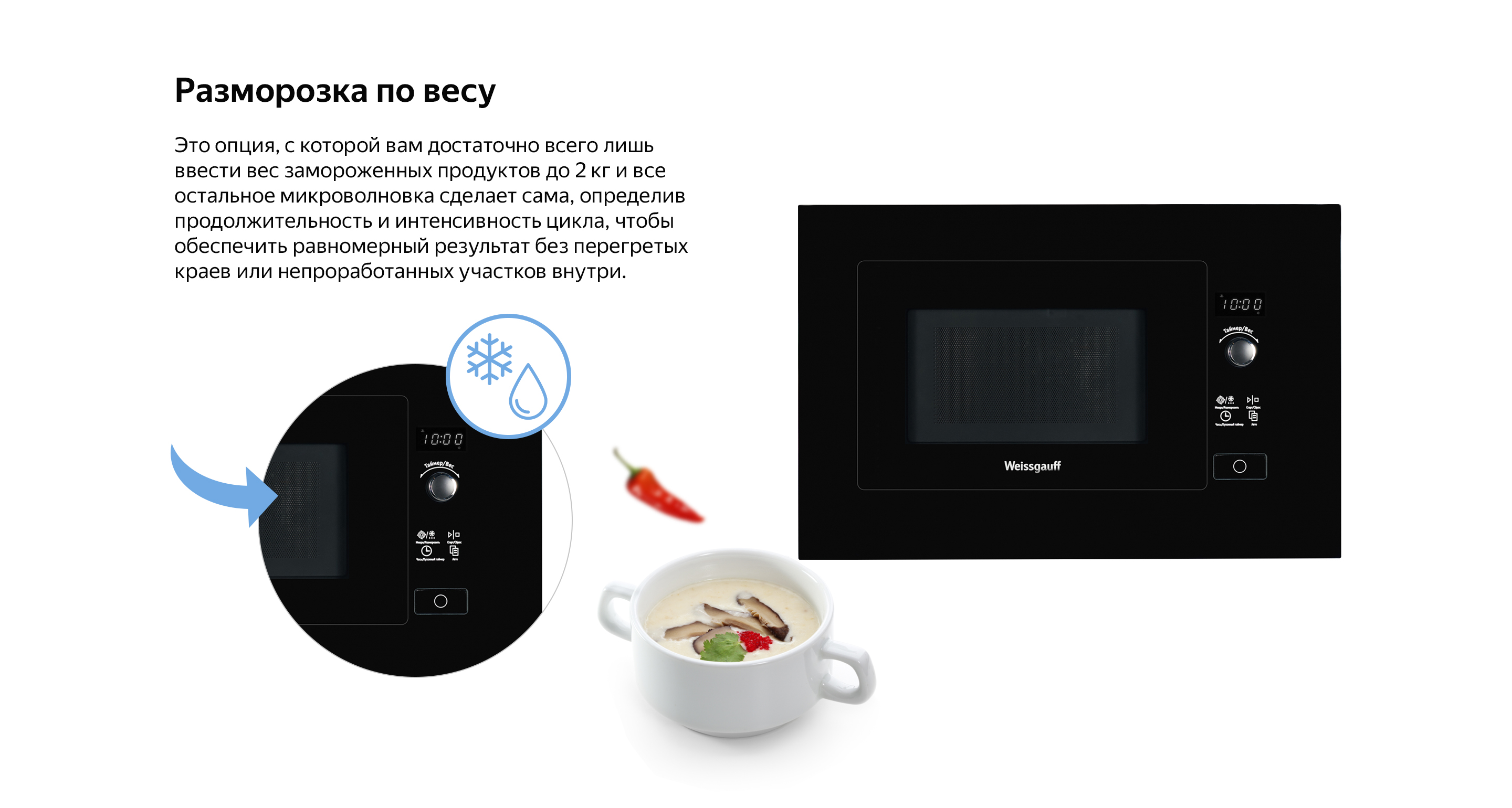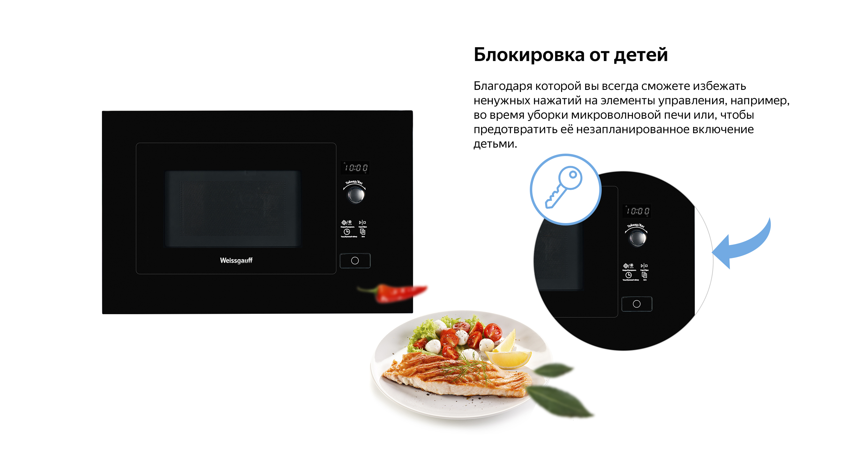 Встраиваемая микроволновая печь Weissgauff в чёрном цвете равномерно разогревает еду без поворотного стола, благодаря системе Spiegel и биокерамическому покрытию White Flat Ceramic.