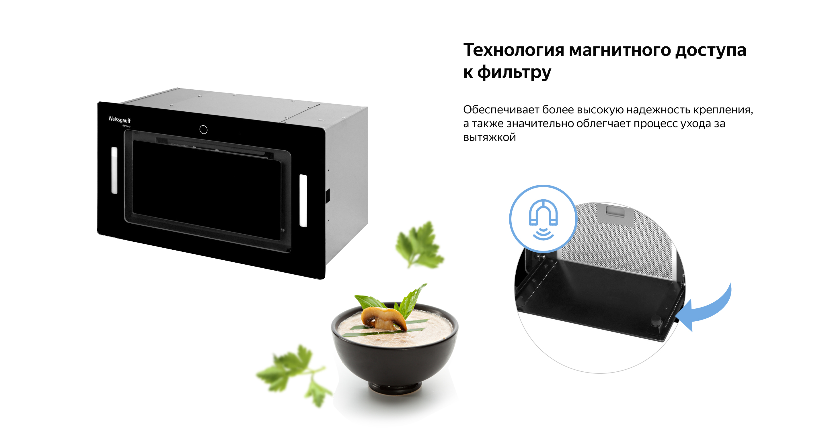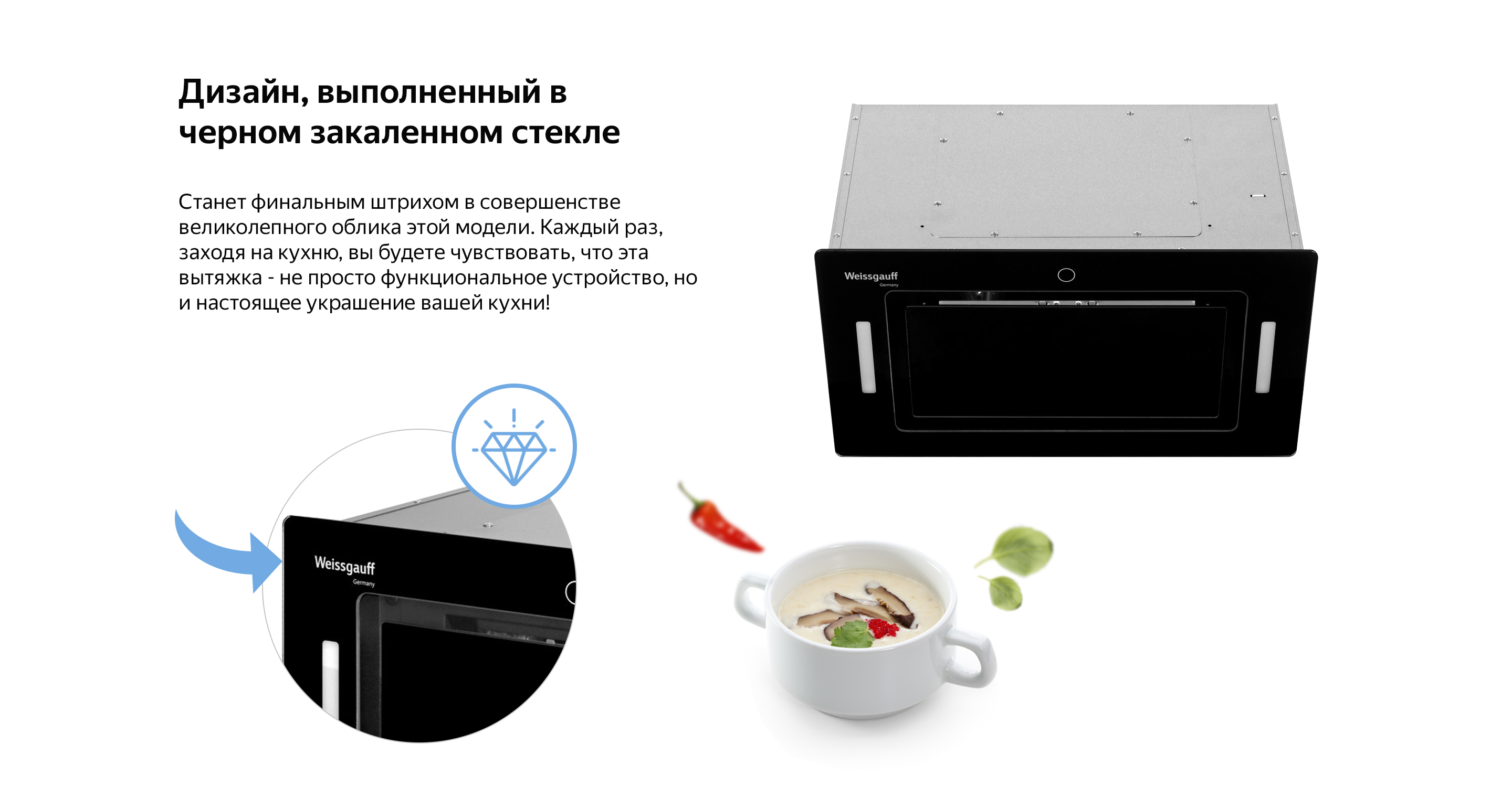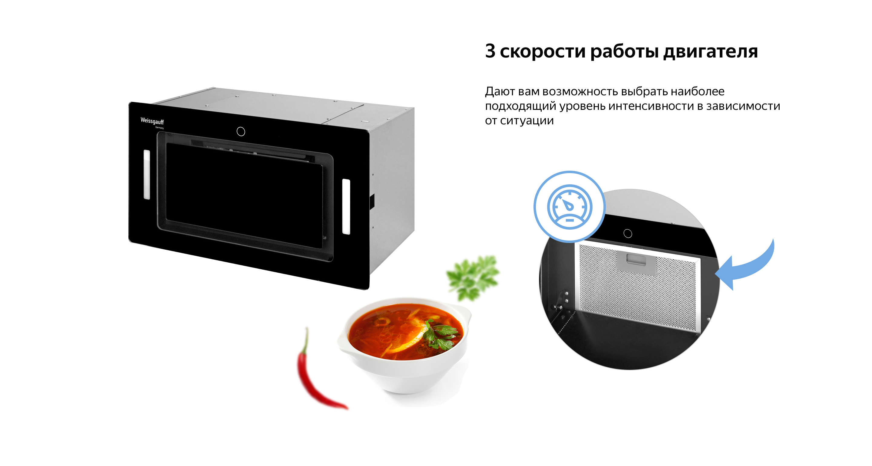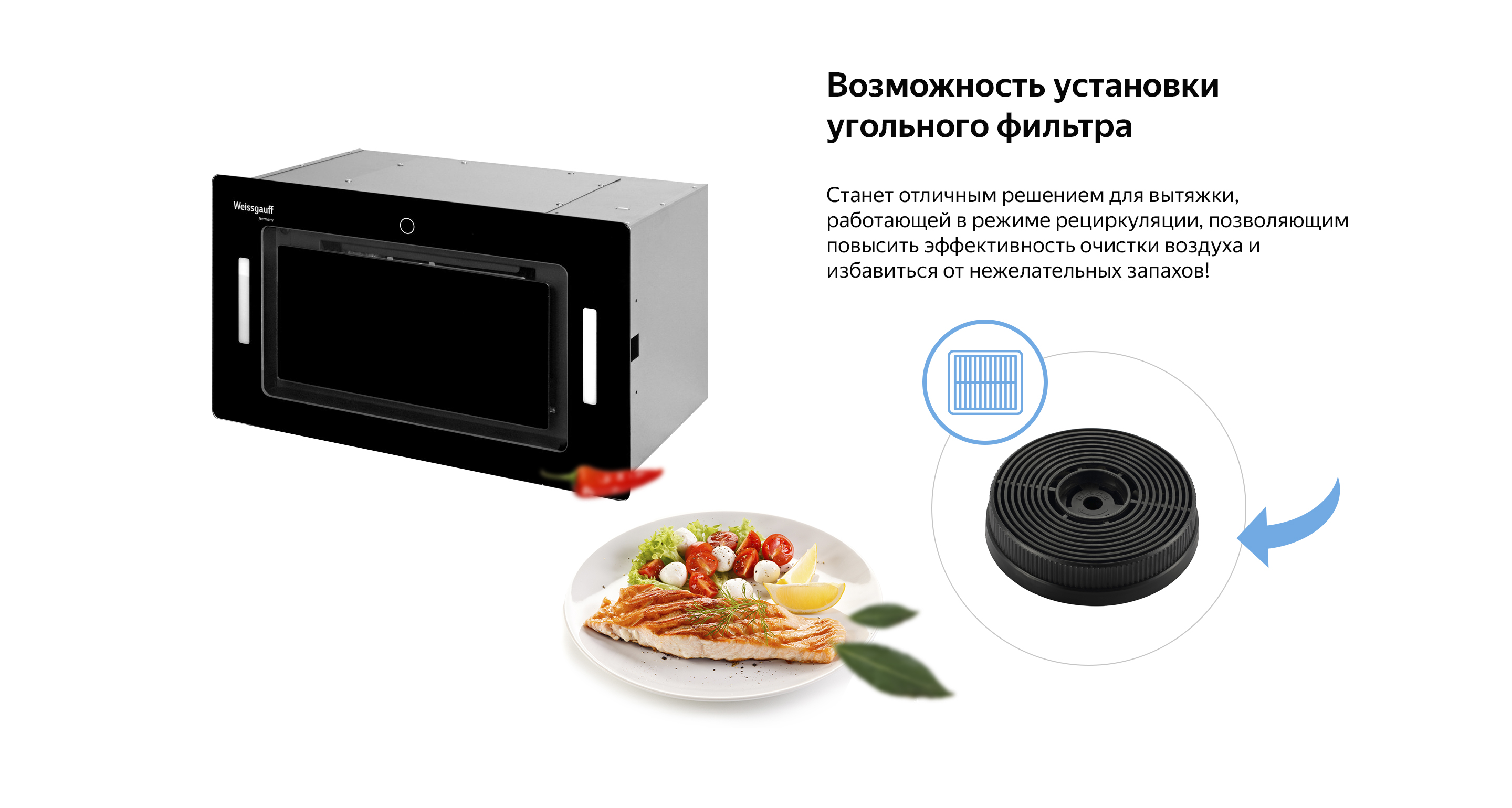 Поистине мощная вытяжка от Weissgauff серии PREMIUM, обладающая ураганной производительностью в 850 м3/ч и оснащенная сенсорным управлением, выполнена в дизайне врезного блока с панелью стильного черного цвета и справится со своей задачей даже на самой большой кухне! К данной модели подходит угольный фильтр Weissgauff UNIVERSAL