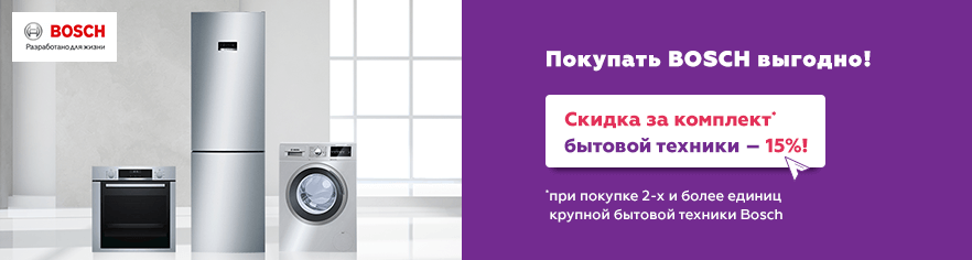 Покупать Bosch стало еще выгоднее! При покупке двух и более единиц крупной бытовой техники – скидка 15%.
