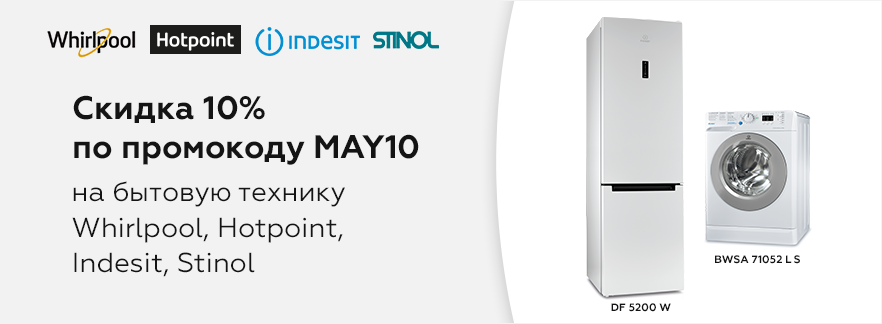 Как показывает практика, промо-кодов много не бывает! Поэтому они действуют и на крупную бытовую технику Whirlpool, Hotpoint, Indesit, Stinol. Добавляйте в корзину и применяйте промо-код MAY10. Акция действует на выделенный на странице акции ассортимент.