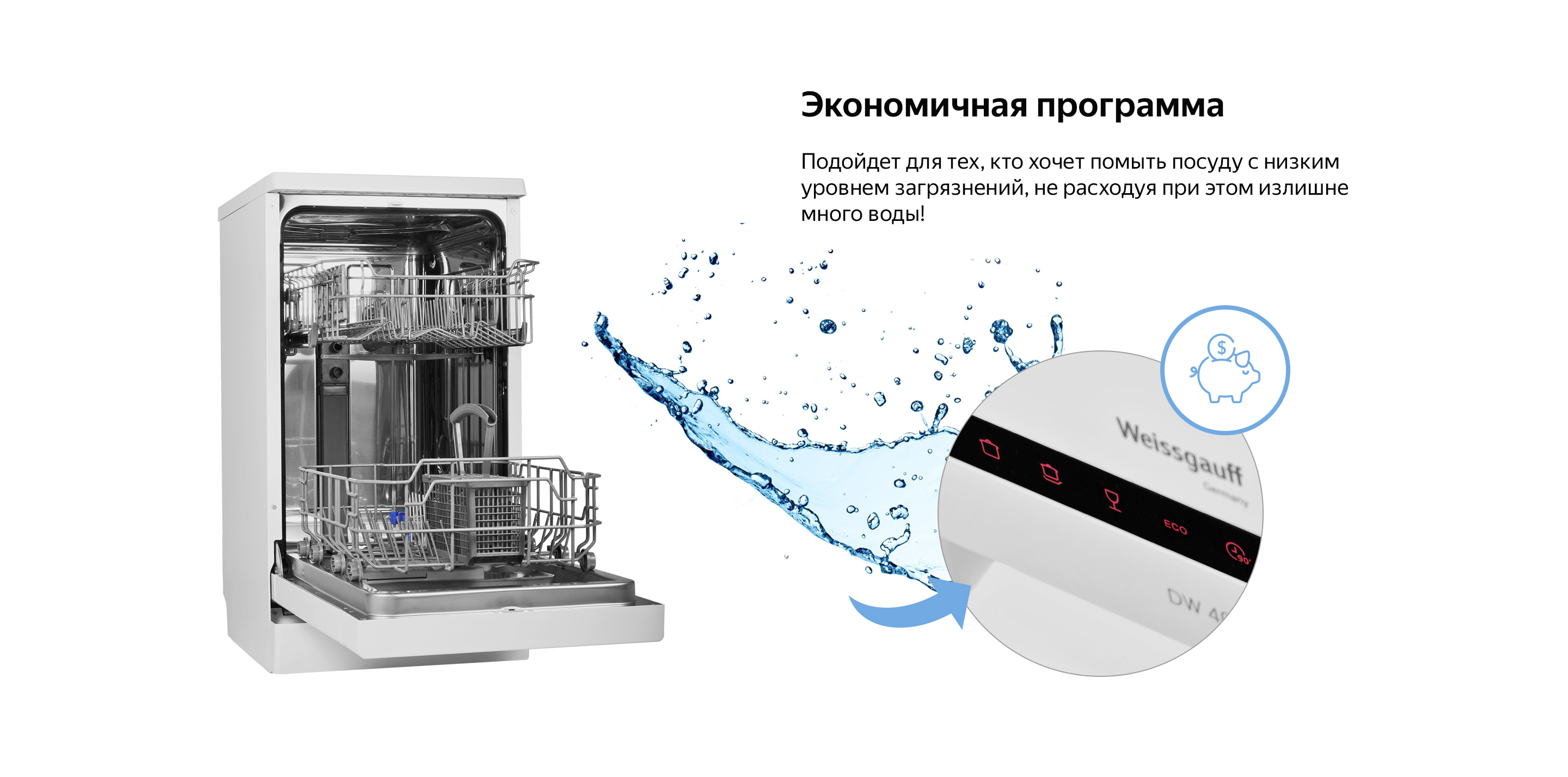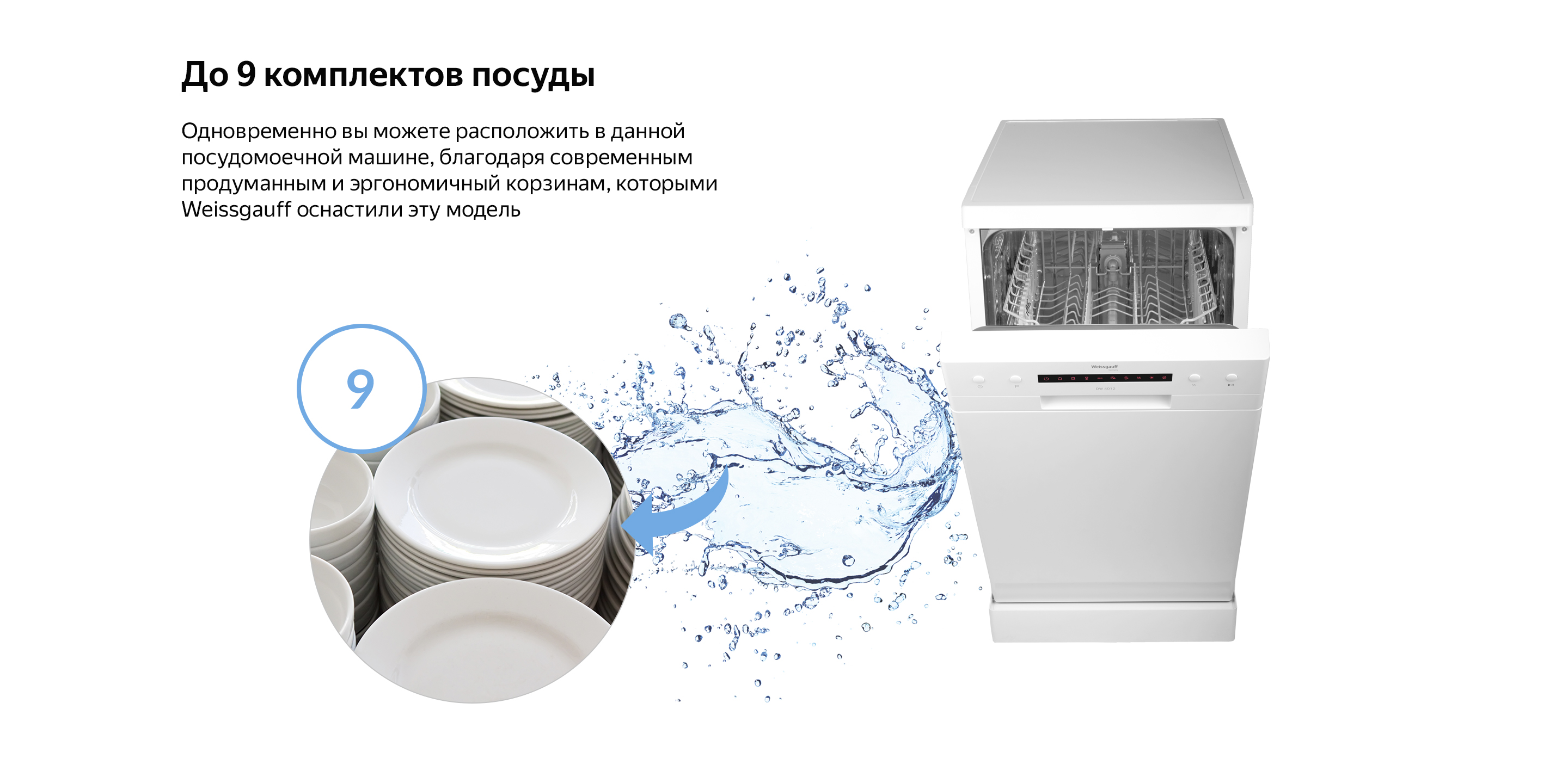 Компактная отдельностоящая посудомоечная машина Weissgauff с полностью электронным управлением, вместимостью посуды до 9 комплектов и вертикальной регулировкой средней корзины - это не только экономия места на кухне, но и отличное качество мытья вашей посуды.