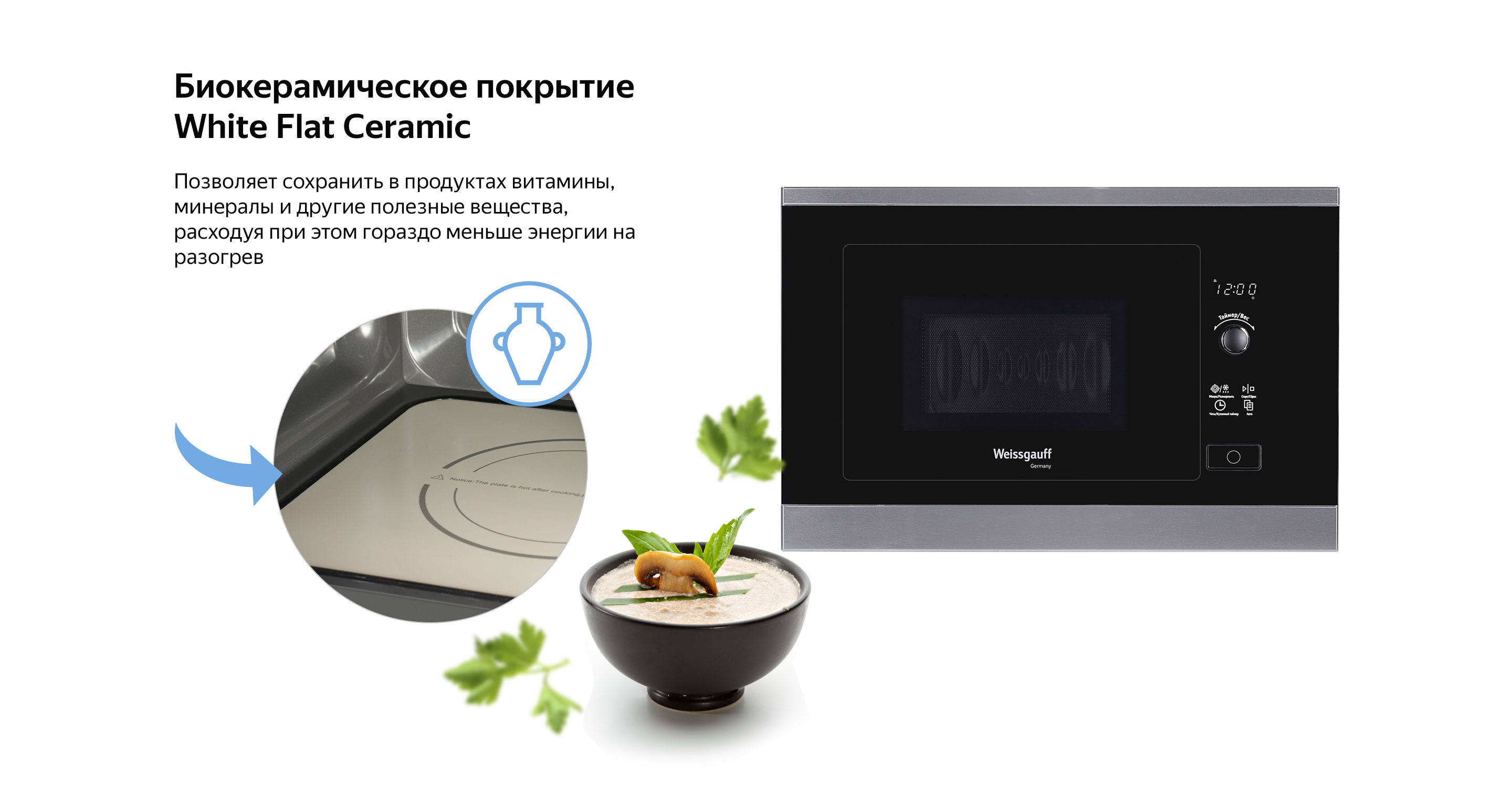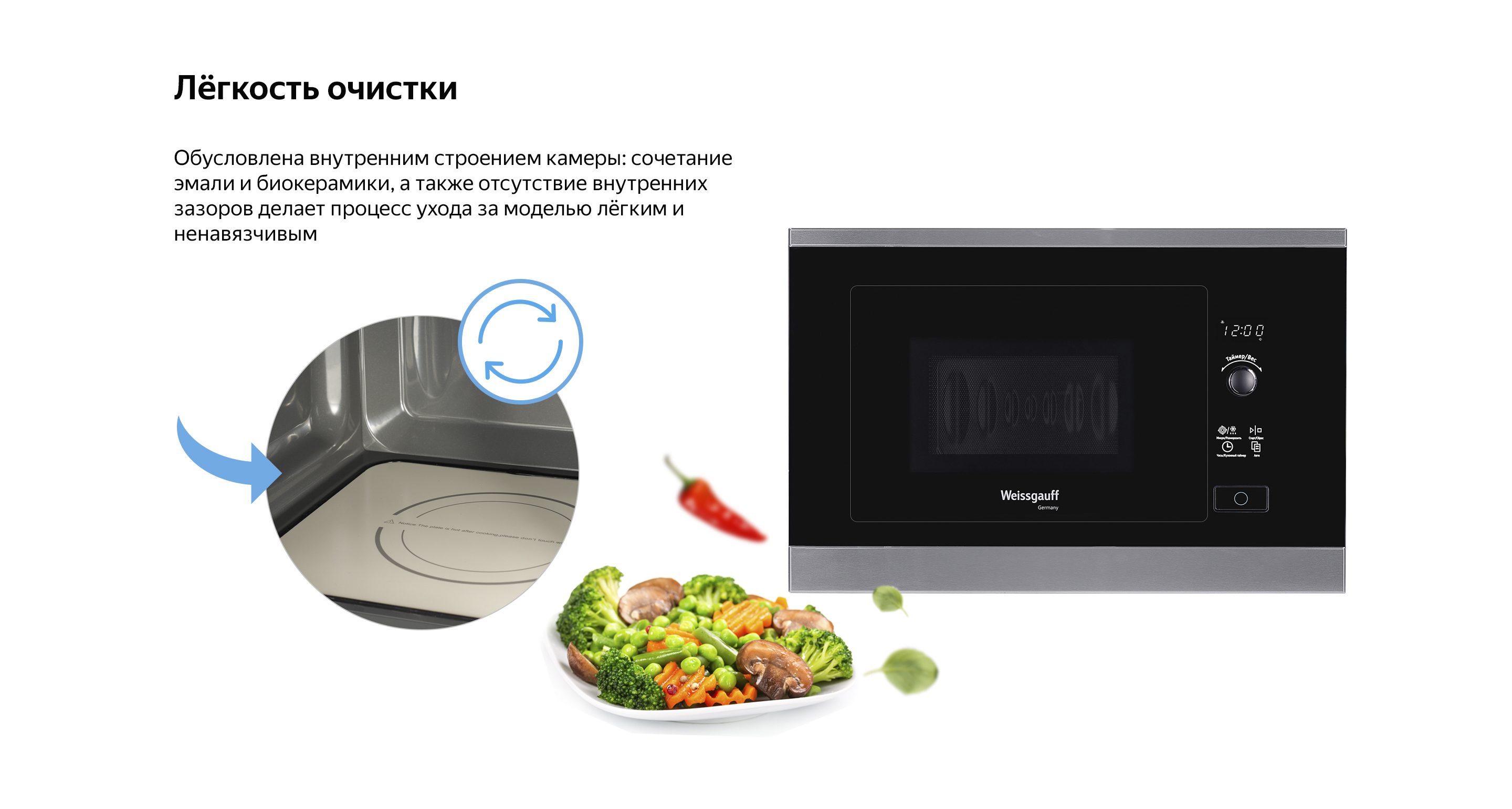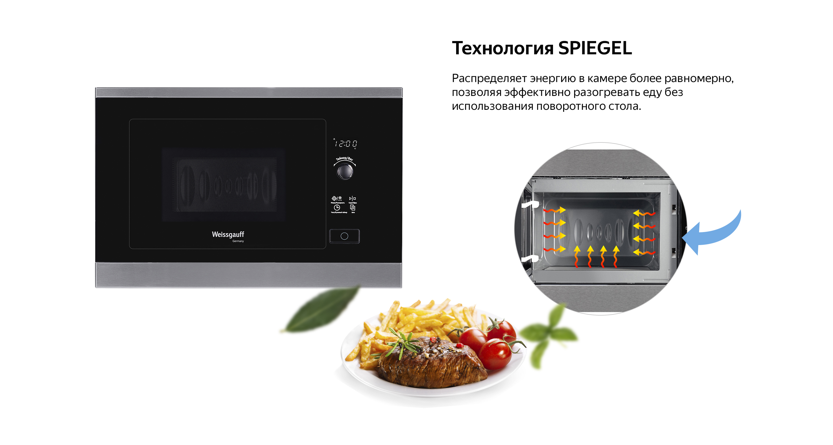 Встраиваемая микроволновая печь Weissgauff в чёрном цвете с элегантными серебристыми панелями из нержавеющей стали равномерно разогревает еду без поворотного стола, благодаря системе Spiegel и биокерамическому покрытию White Flat Ceramic.