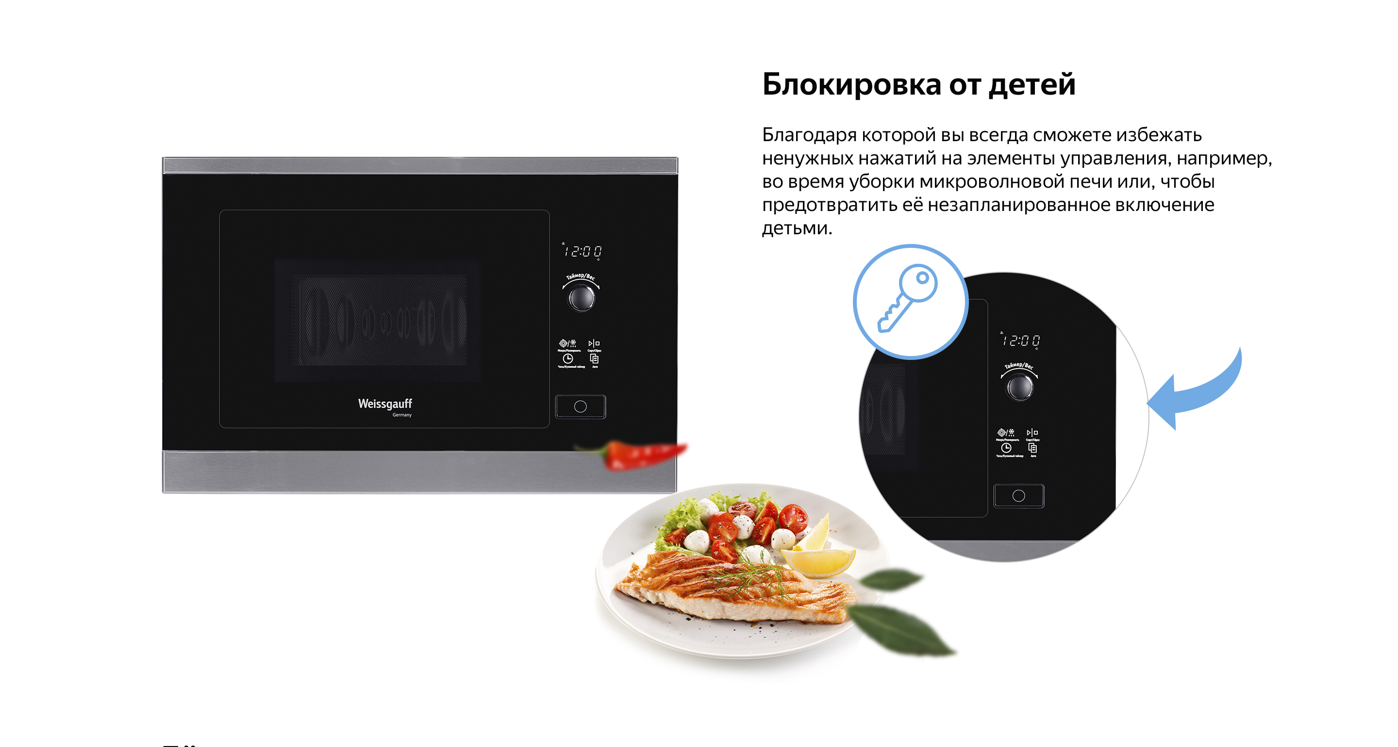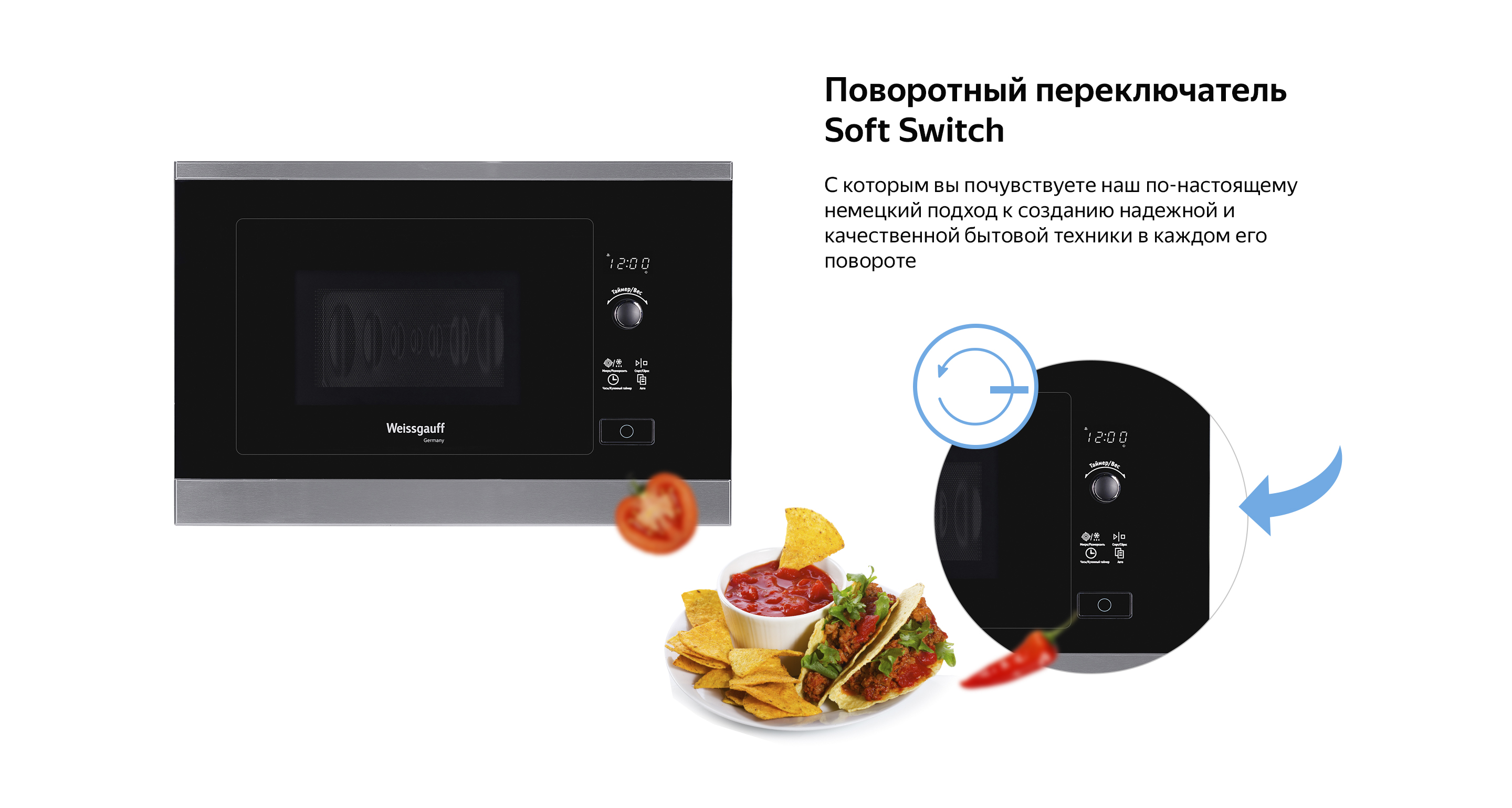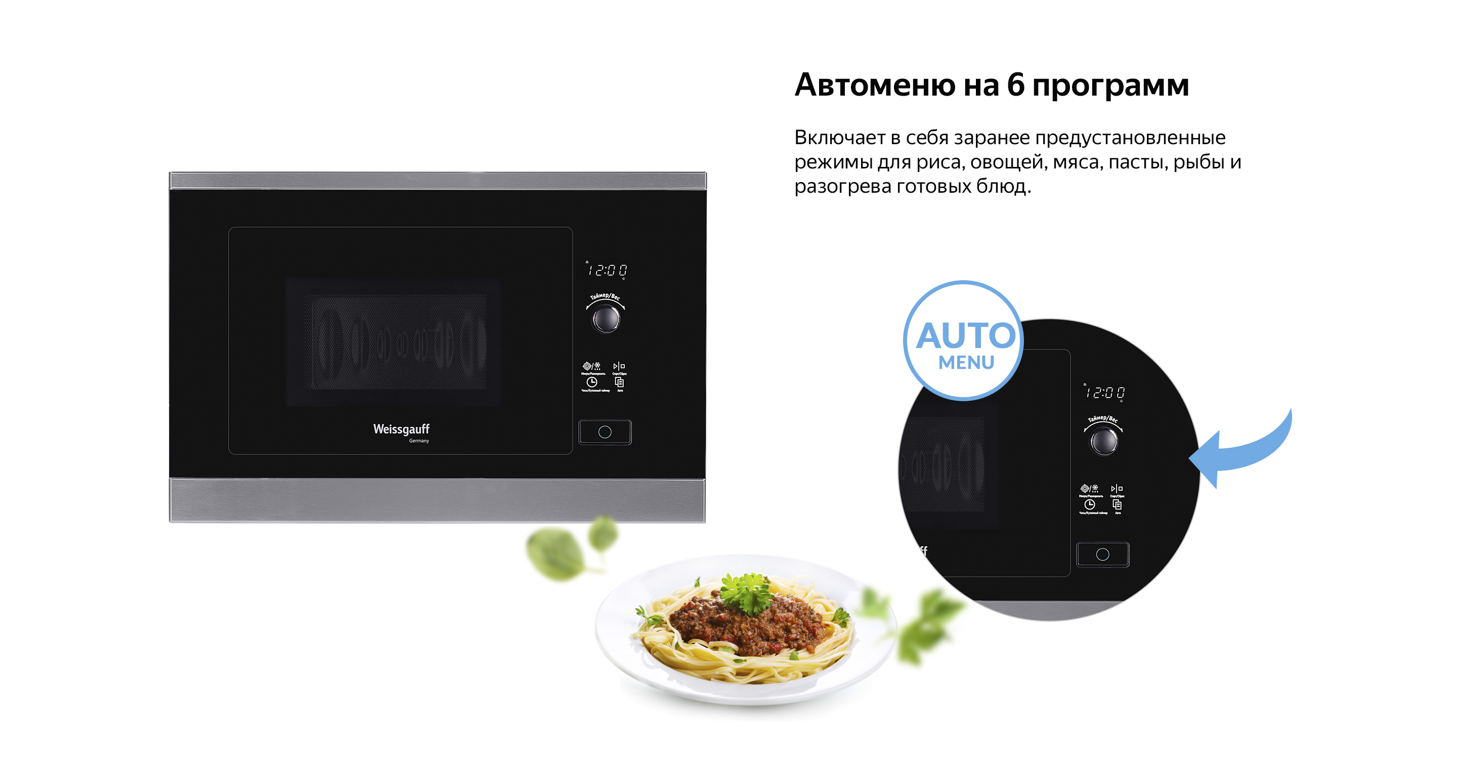 Встраиваемая микроволновая печь Weissgauff в чёрном цвете с элегантными серебристыми панелями из нержавеющей стали равномерно разогревает еду без поворотного стола, благодаря системе Spiegel и биокерамическому покрытию White Flat Ceramic.