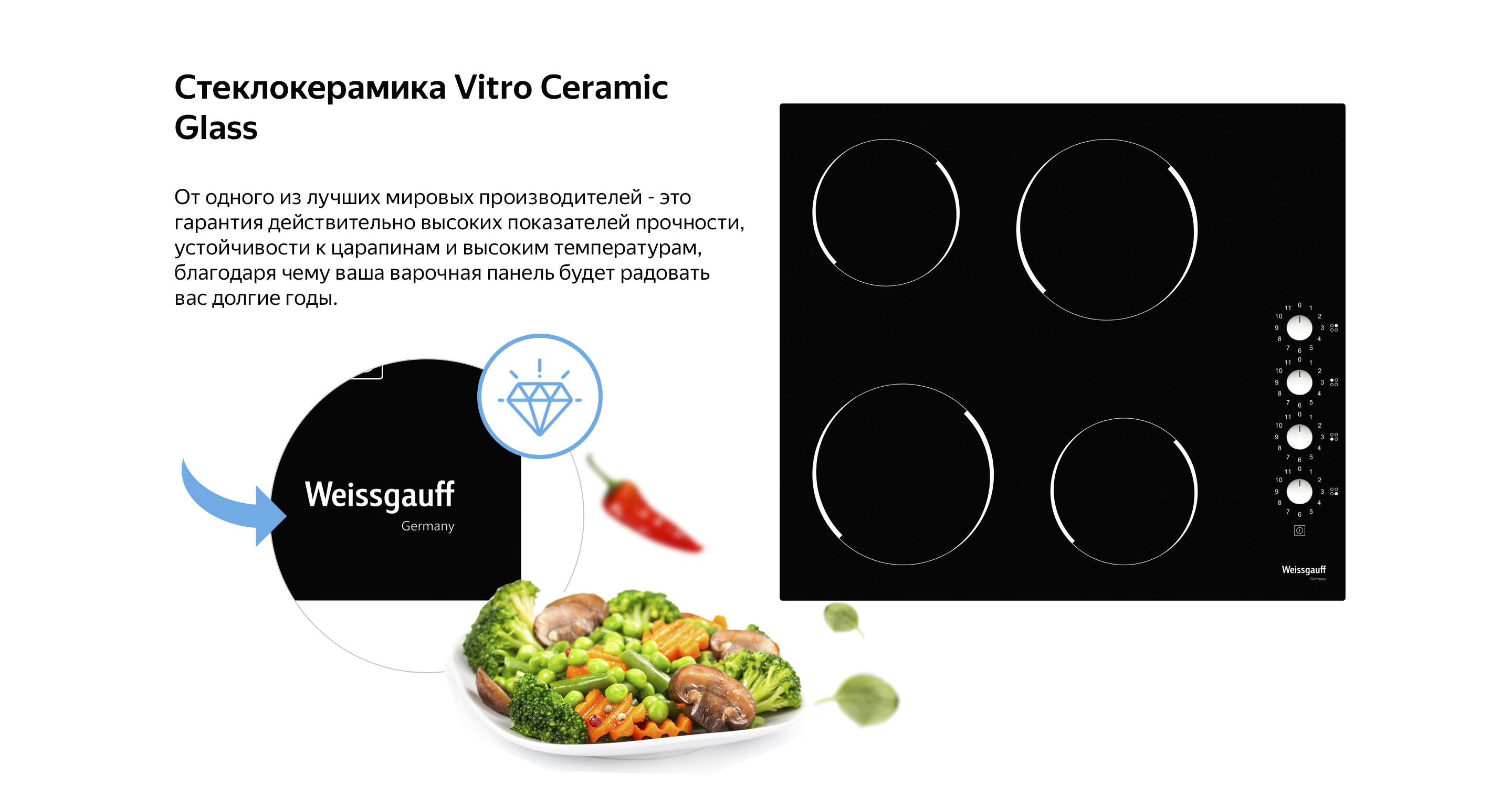 У электрических варочных панелей подобного типа в качестве основного материала используется стеклокерамика. Ее легко очищать от разных загрязнений, что придется по душе любой хозяйке. Еще одним преимуществом этой модели является доступная цена, по которой можно купить электрическую варочную панель Weissgauff HV 640 BK в нашем интернет-магазине.