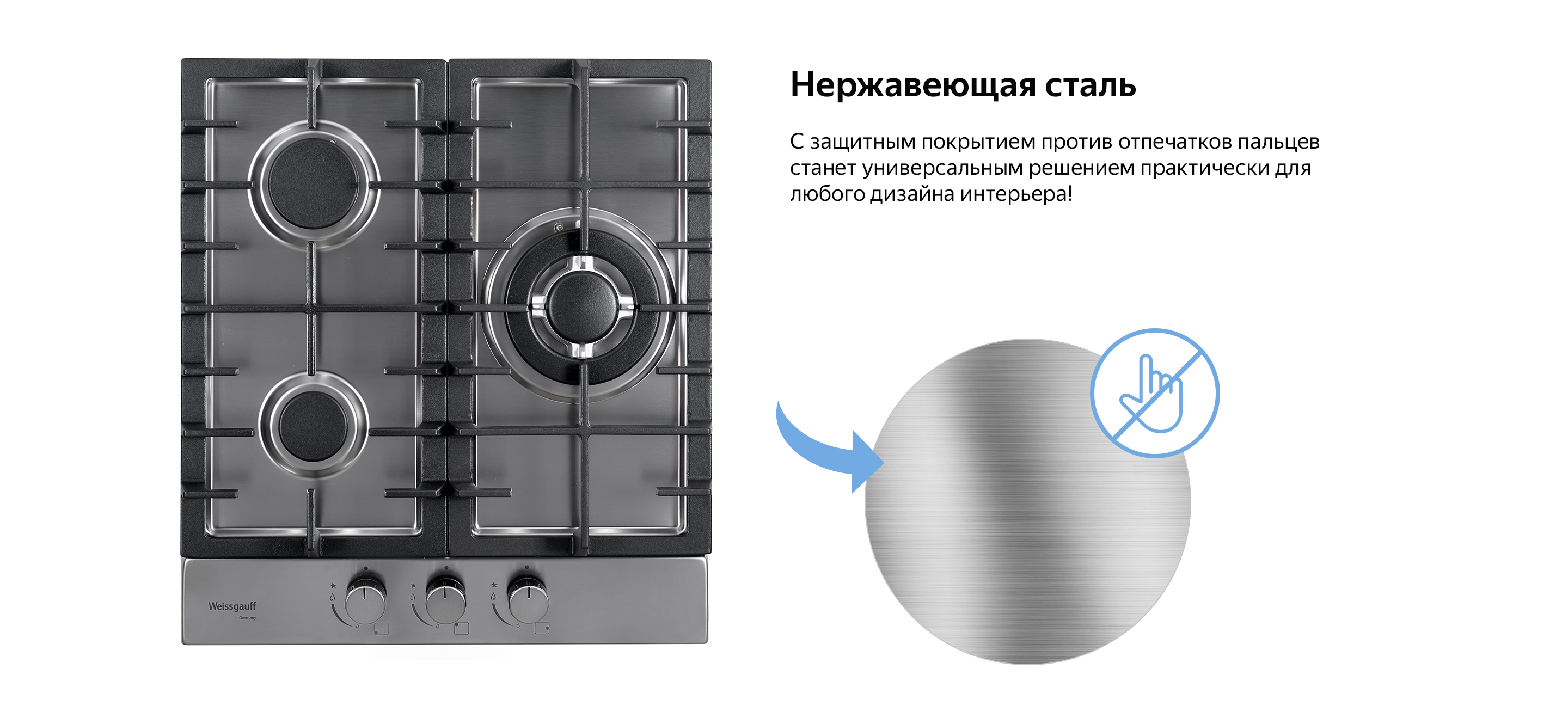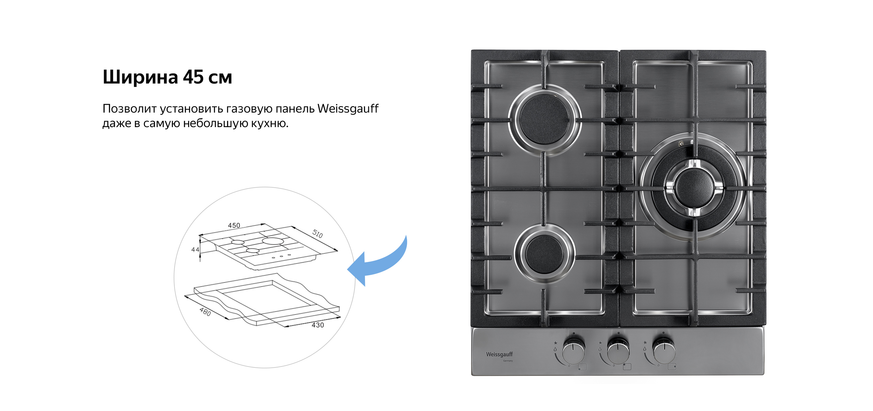 Встраиваемая независимая газовая панель Weissgauff шириной 45 см, исполненная в нержавеющей стали - это стильное и компактное решение для вашей кухни!