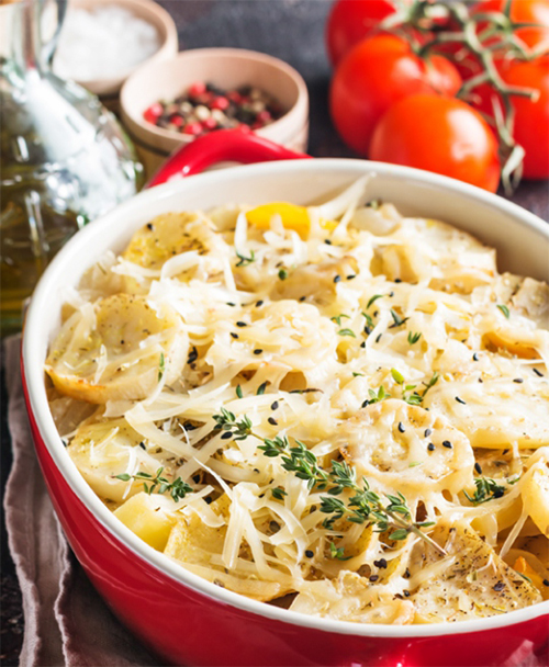 Картофельную запеканку поставить в предварительно разогретую духовку до 180 градусов и поставить на 50-60 минут в режиме «нижний нагрев». За 5 минут до окончания, посыпать запеканку тертым сыром и включить режим «верхний нагрев».