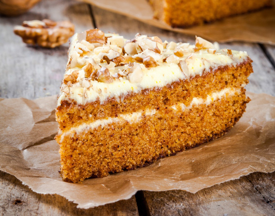 Морковь почистить, натереть на мелкой терке. Отложить. Счистить цедру с апельсина, используя мелкую терку. Орехи измельчить. Отложить. В отдельной миске смешать муку, разрыхлитель, корицу и мускатный орех. Яйца с сахаром тщательно взбить миксером до воздушной консистенции. Добавить масло, еще раз взбить. Ввести морковь, цедру апельсина, грецкие орехи, немного взбить. Далее частями добавлять сухую смесь из миски, тщательно вымешивая снизу вверх. Форму для выпечки смазать маслом, выложить тесто, поставить в разогретую до 180 градусов мини печь. Выпекать до готовности примерно 35-40 минут в режиме «нижний нагрев». Готовый корж остудить. Затем разретать корж на две неравные части.
