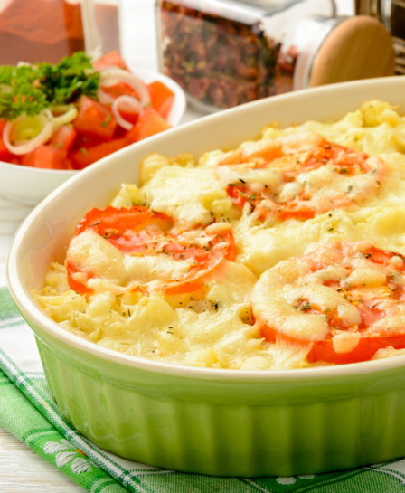 Противень смазать растительным маслом, выложить фарш. Поверх фарша выложить овощную смесь из миски. Помидоры очистить от кожуры, мелко порезать и выложить поверх овощной смеси.