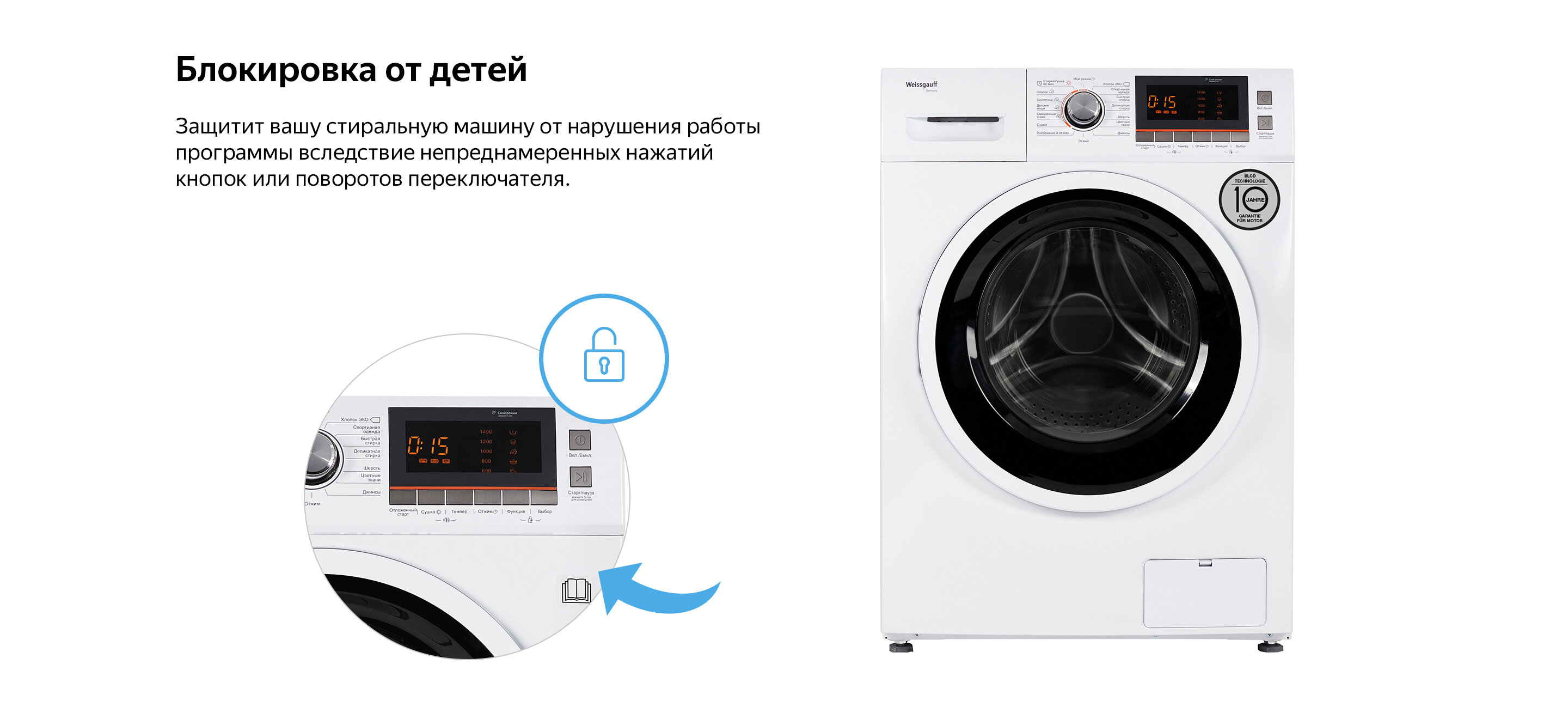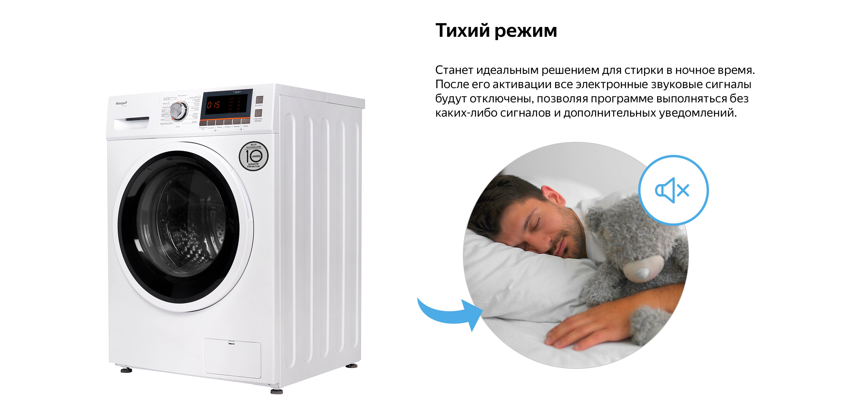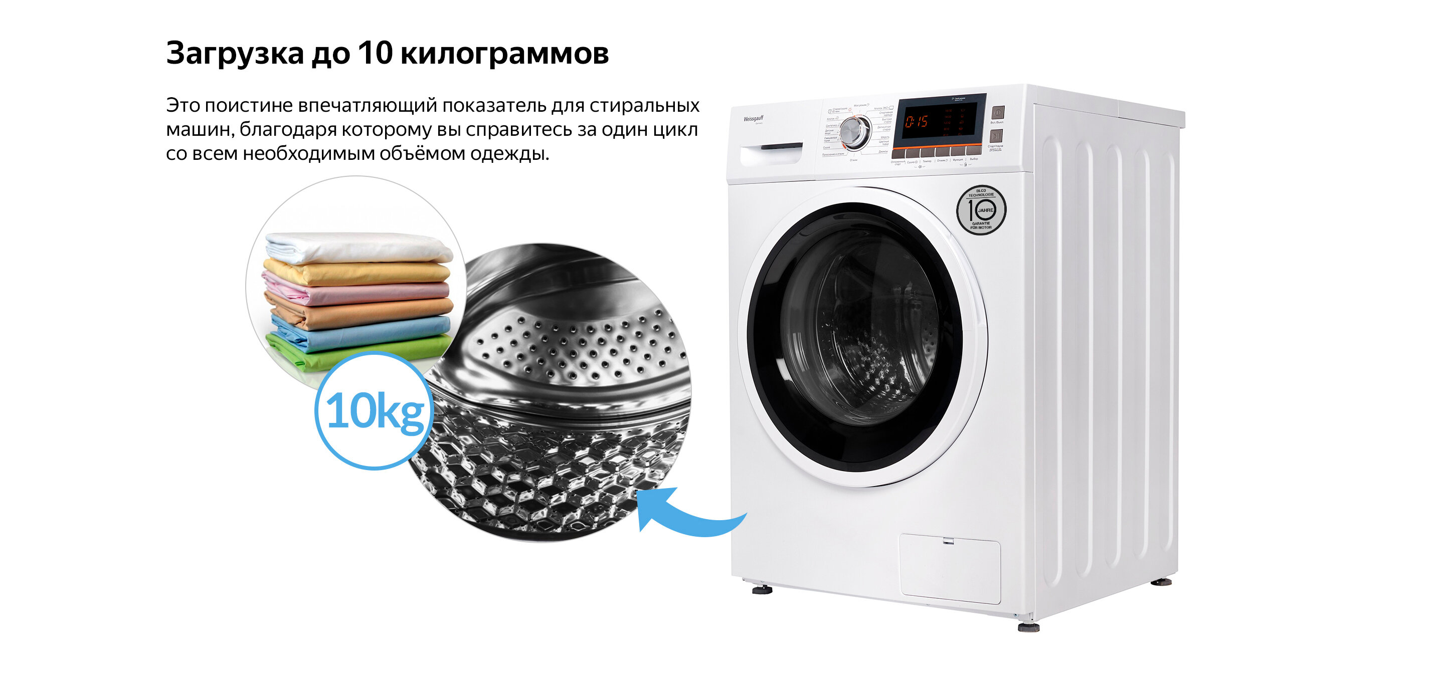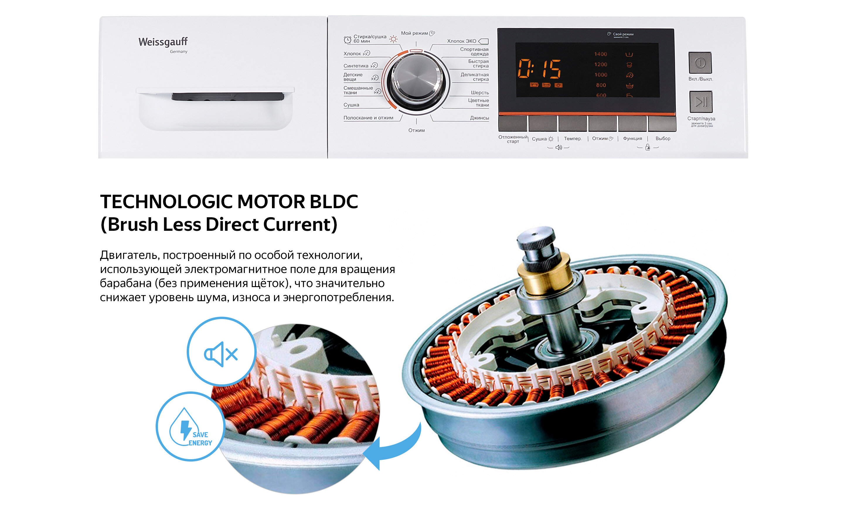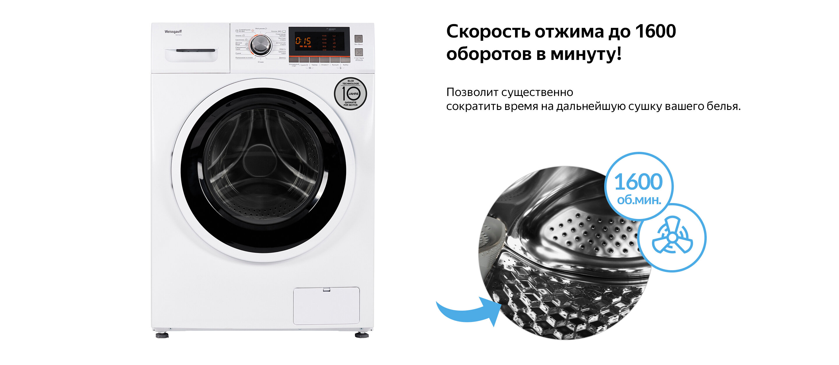 Отдельностоящая стиральная машина с сушкой Weissgauff, оснащенная двигателем, работающим по особой технологии BLDC, имеет фантастический показатель загрузки до 10 килограммов белья и невероятную скорость отжима до 1600 оборотов в минуту - это гарантия непревзойденной эффективности и высокого результата при каждой стирке вашего белья.