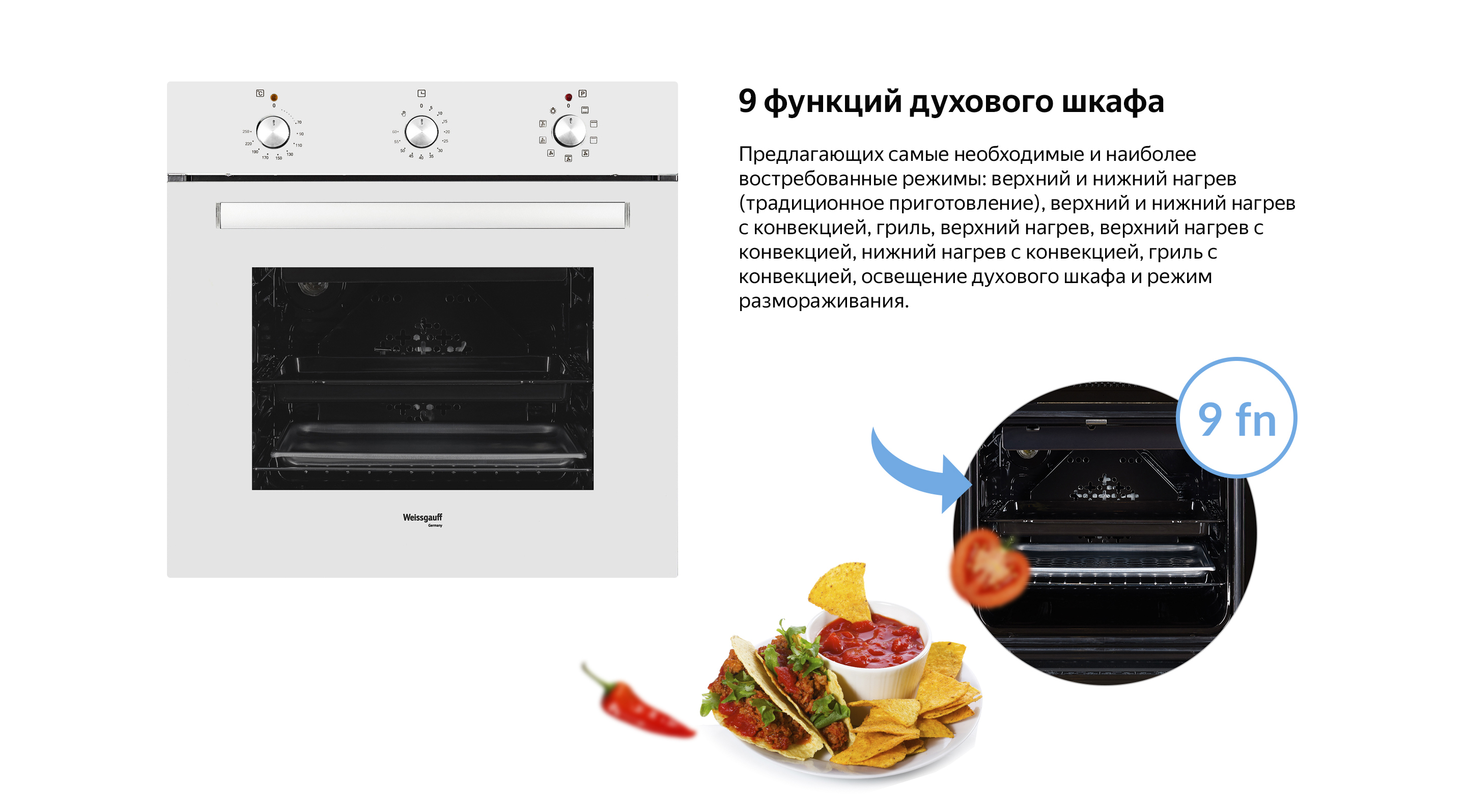 Опыт использования: Несколько днейДостоинства:паровая очистка, да и в целом очень удобная духовкаНедостатки:не вижуКомментарий:Совсем недавно уставновили духовку Weissgauff EOV 19 MW в новой квартире. Пока меня и жену все устраивает. Качество сборки отменное, ничего не болтается, не шатается, вентилятор крутится, его даже и не слышно. В общем, все сделано с душой и с умом. Паровая очистка внутри это нечто, лично я никогда сам не чистил духовку, но видел, как жена карячится при этом, а теперь просто протерла и никаких усилий. Если бы еще производители вертел добавили, было бы еще круче, но и без него перетопчимся)