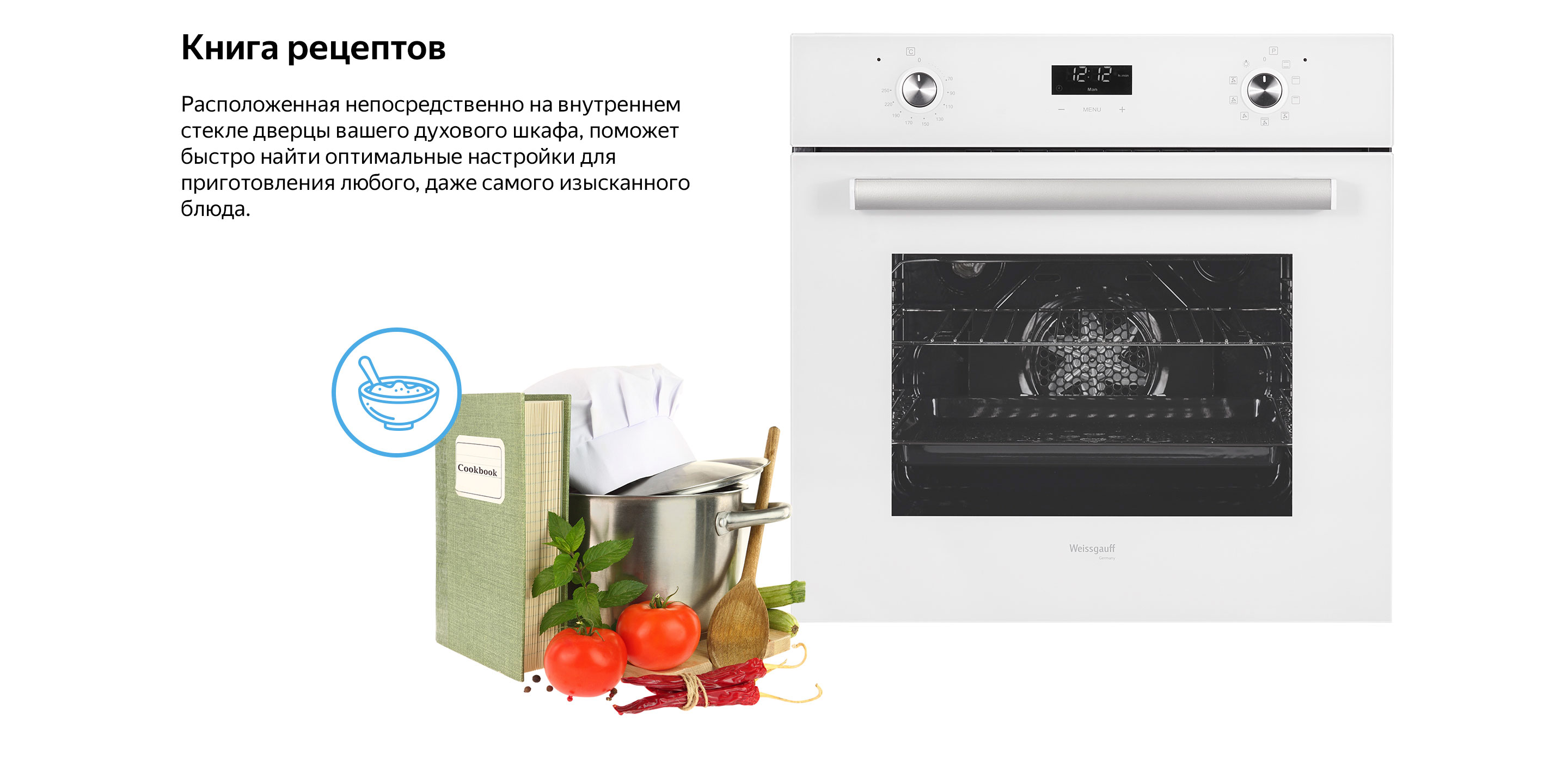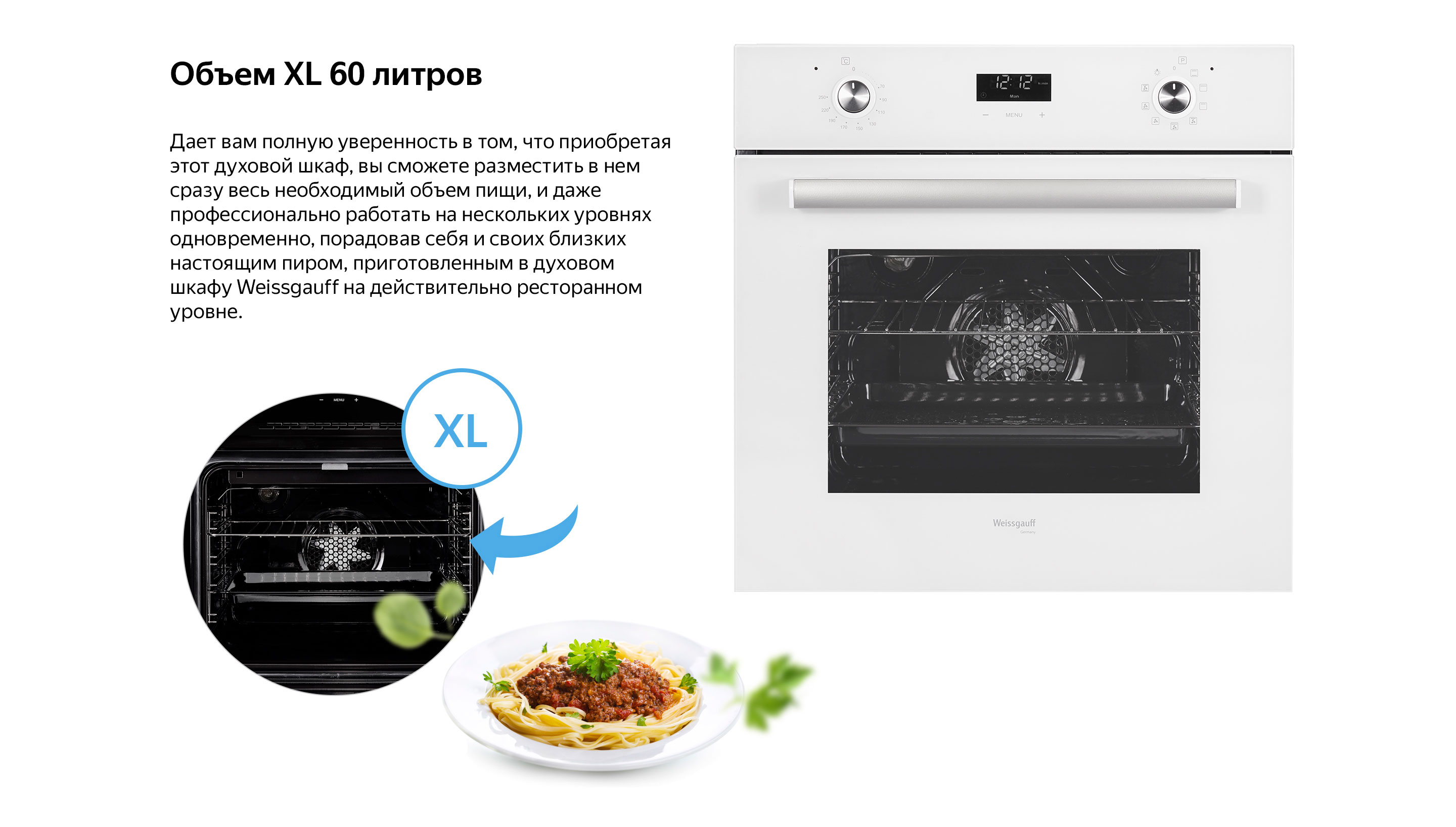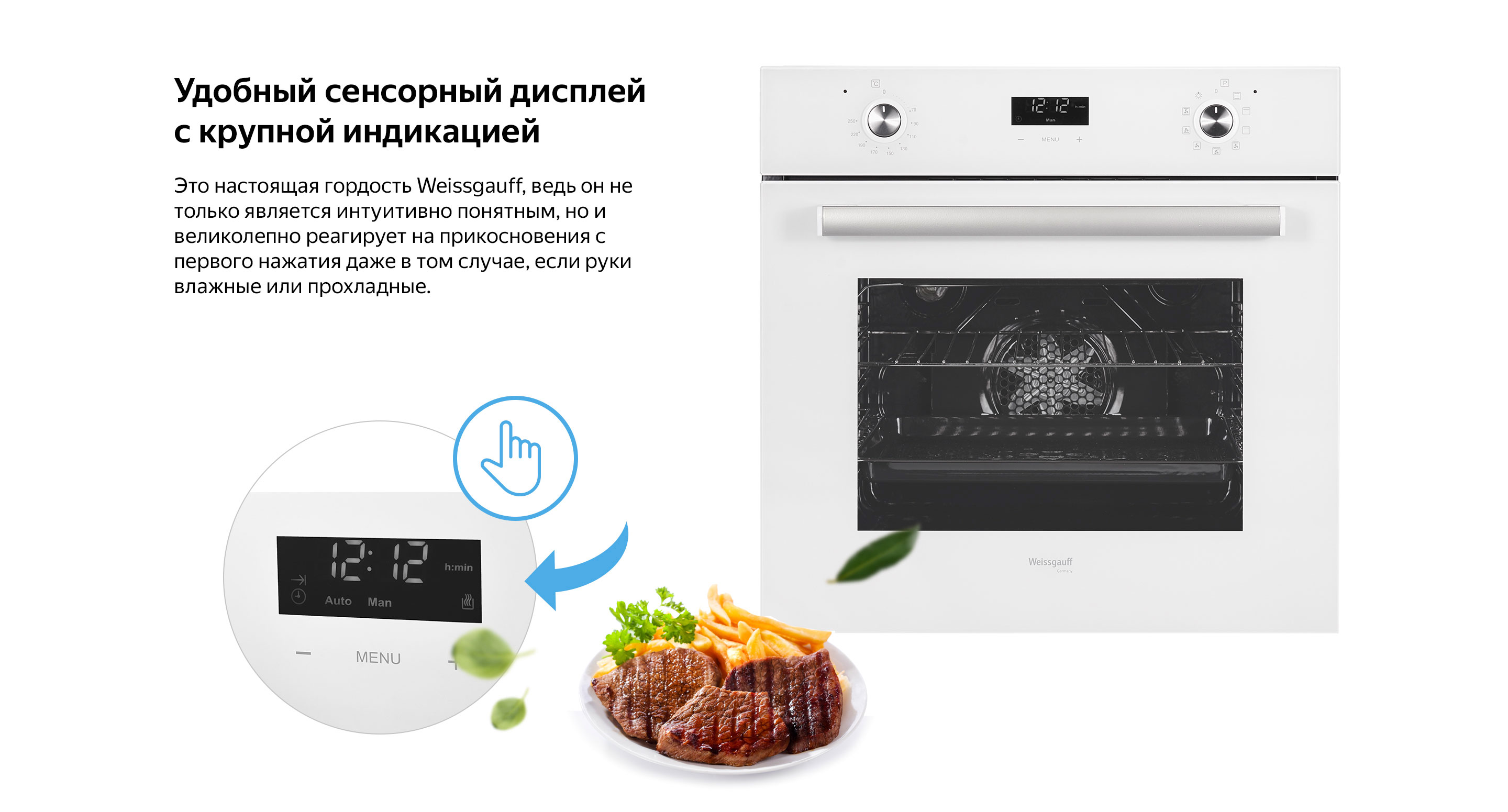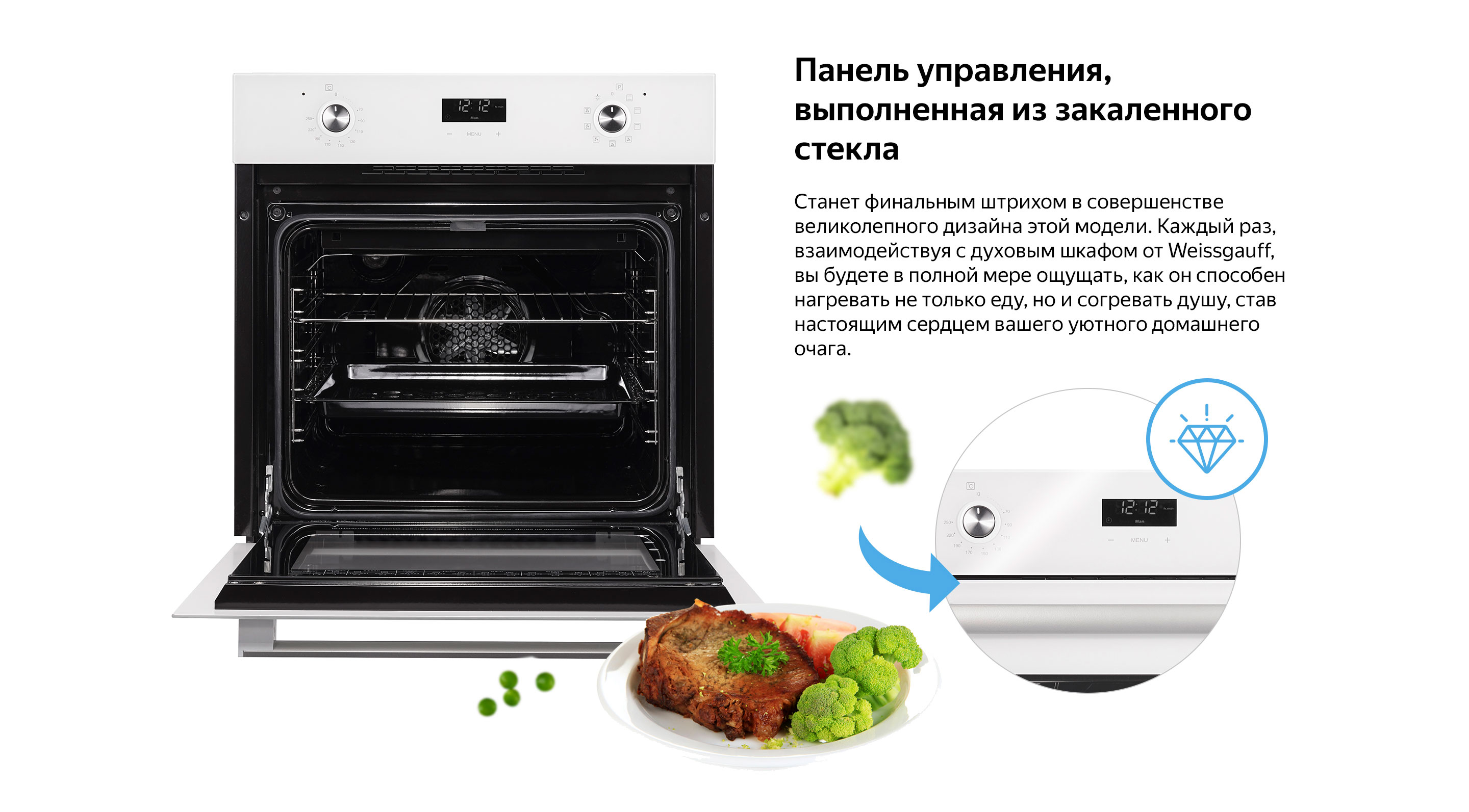 Электрический духовой шкаф от Weissgauff, выполненный в белом цвете, оснащён чувствительным сенсорным управлением, утапливаемыми рукоятками PIPO и 9 режимами, каждый из которых раскроет для вас новые возможности приготовления вкуснейших блюд!