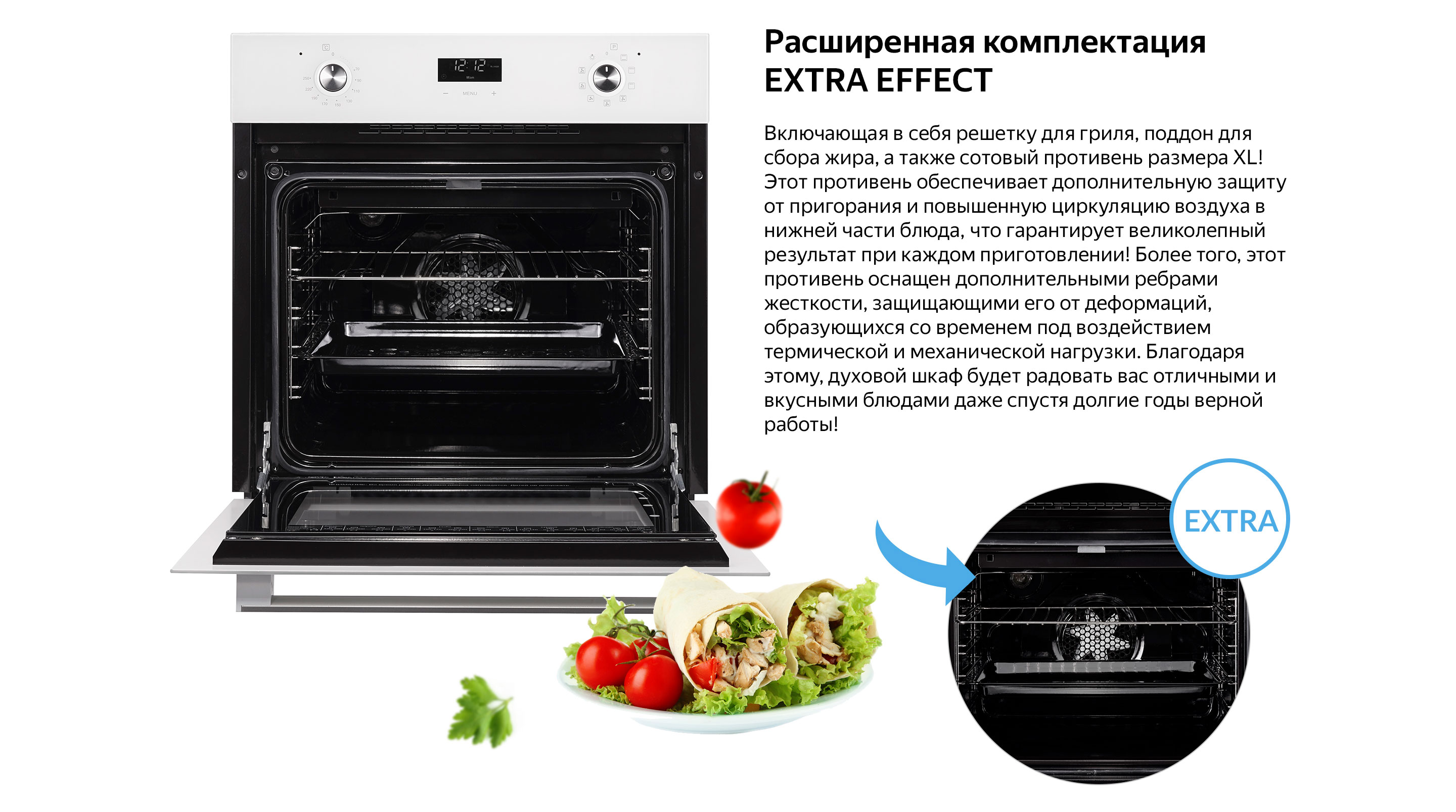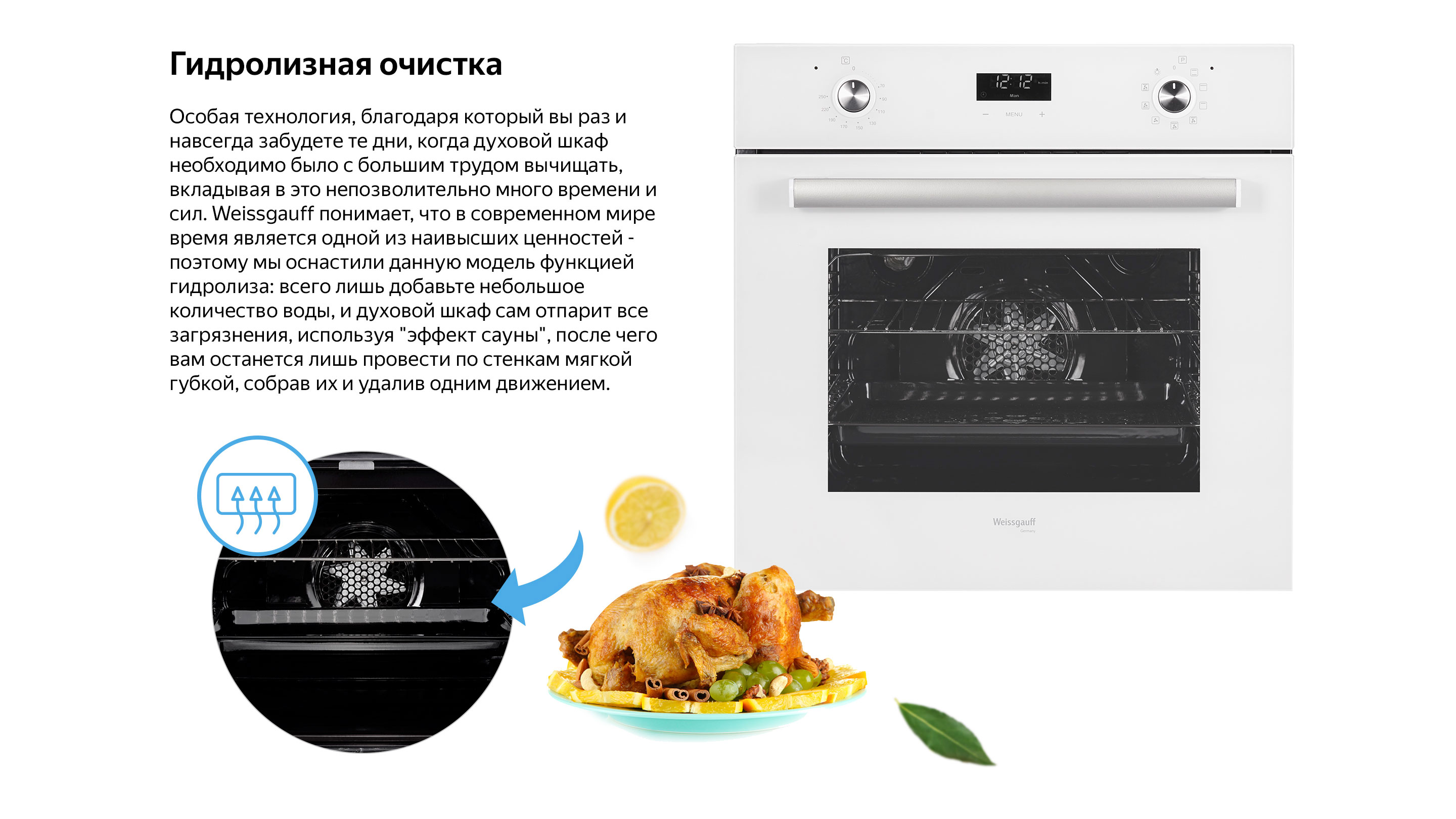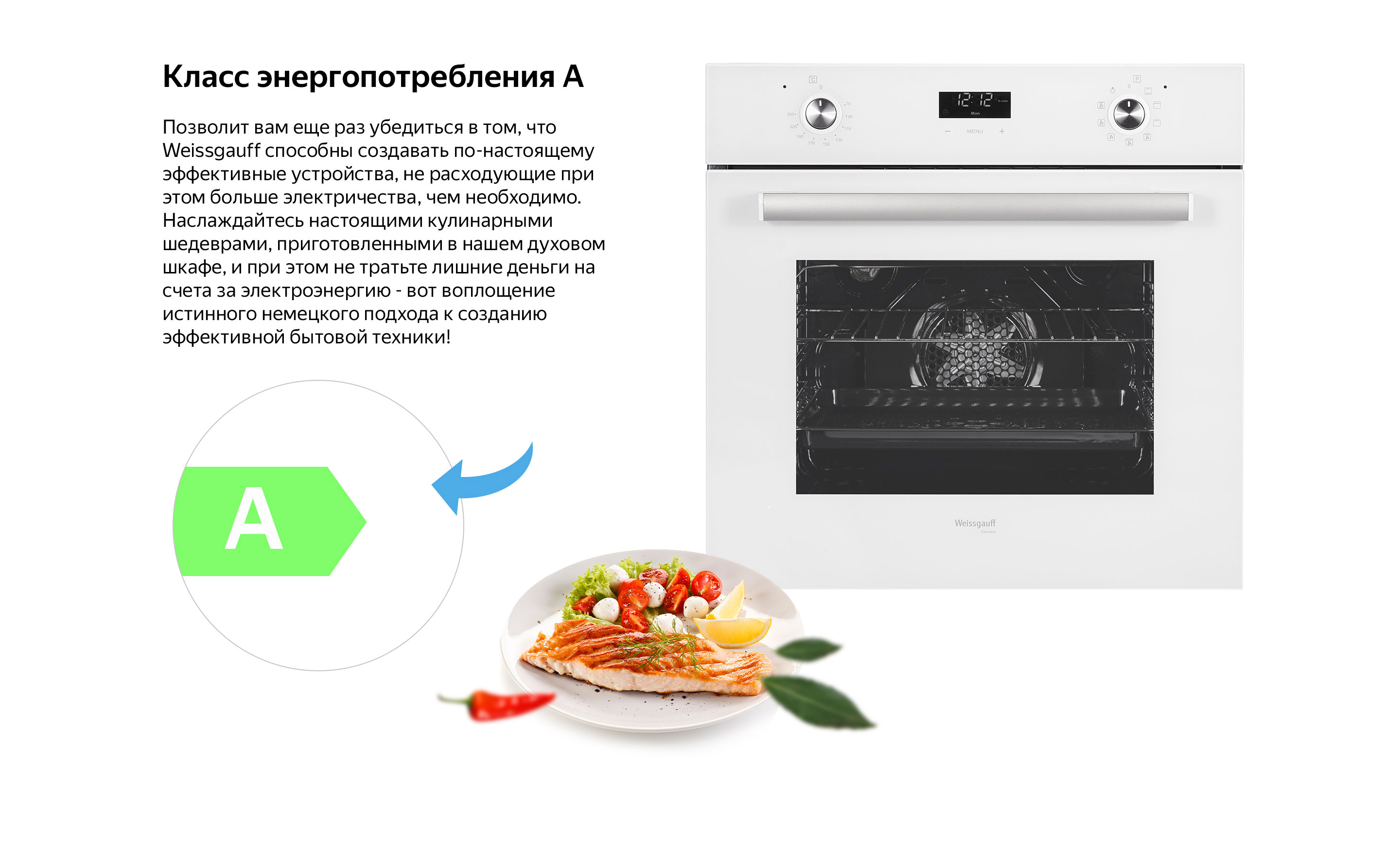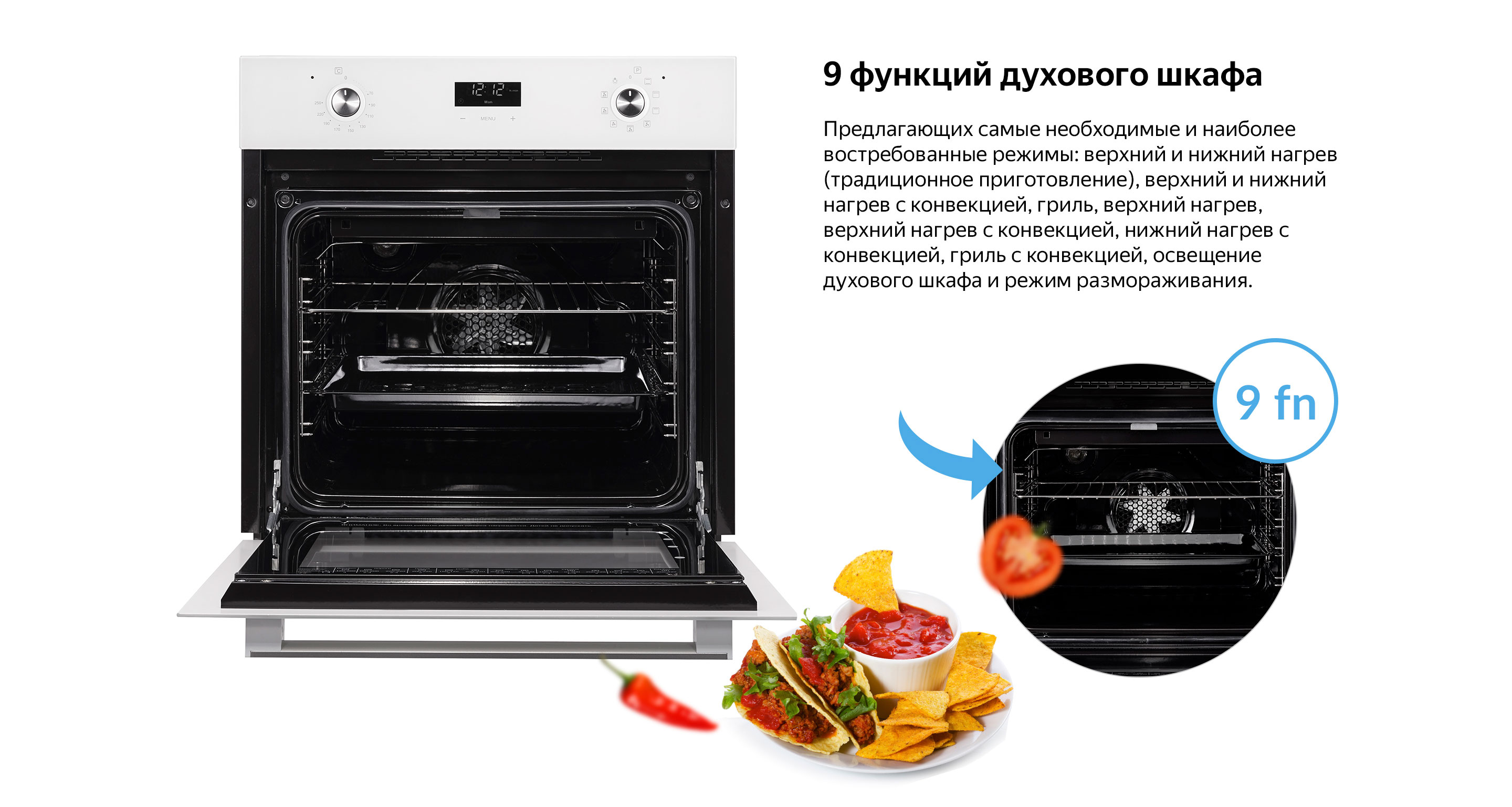 Электрический духовой шкаф от Weissgauff, выполненный в белом цвете, оснащён чувствительным сенсорным управлением, утапливаемыми рукоятками PIPO и 9 режимами, каждый из которых раскроет для вас новые возможности приготовления вкуснейших блюд!