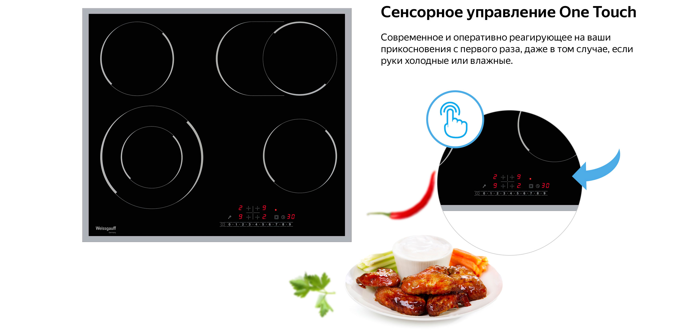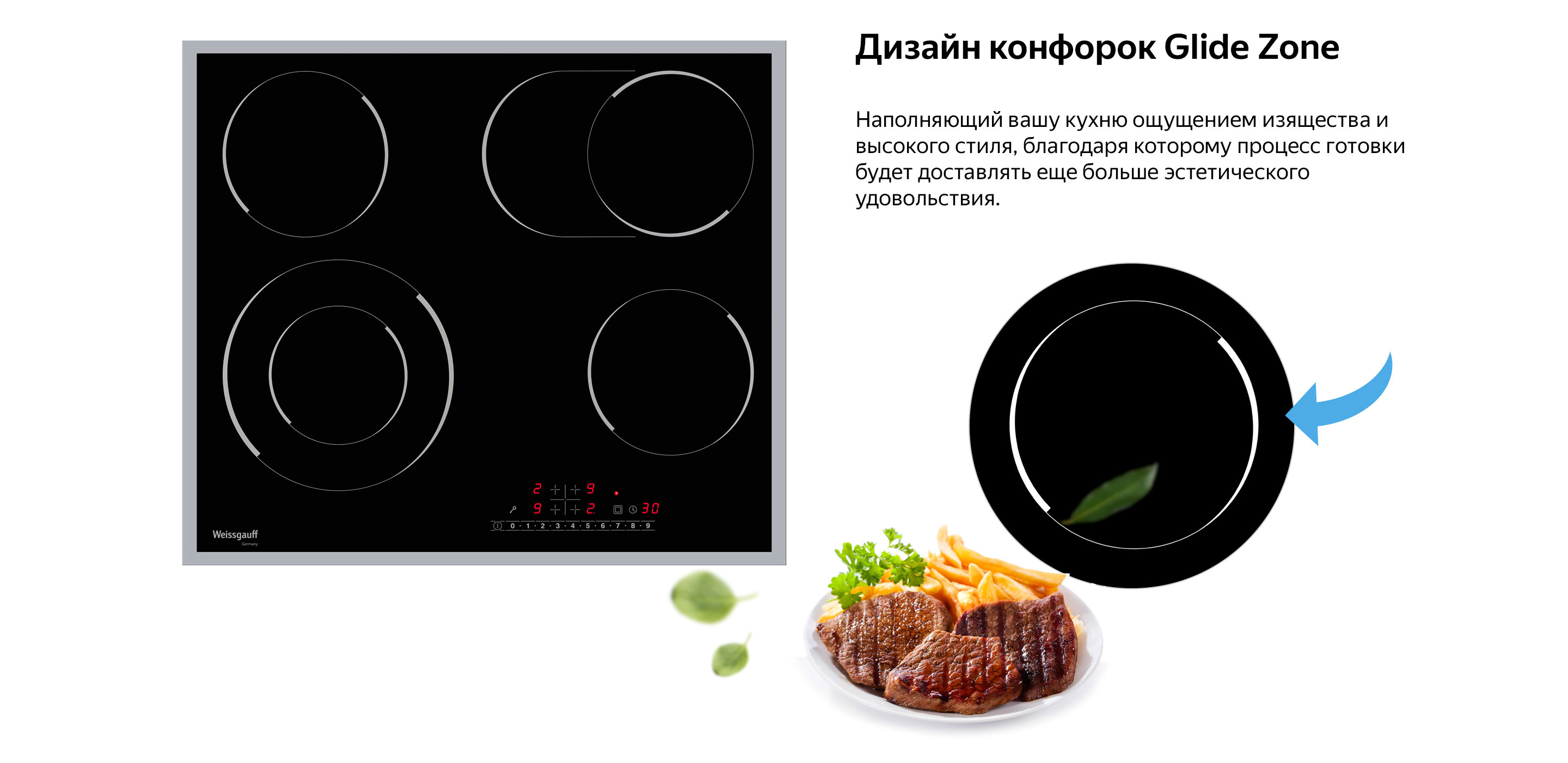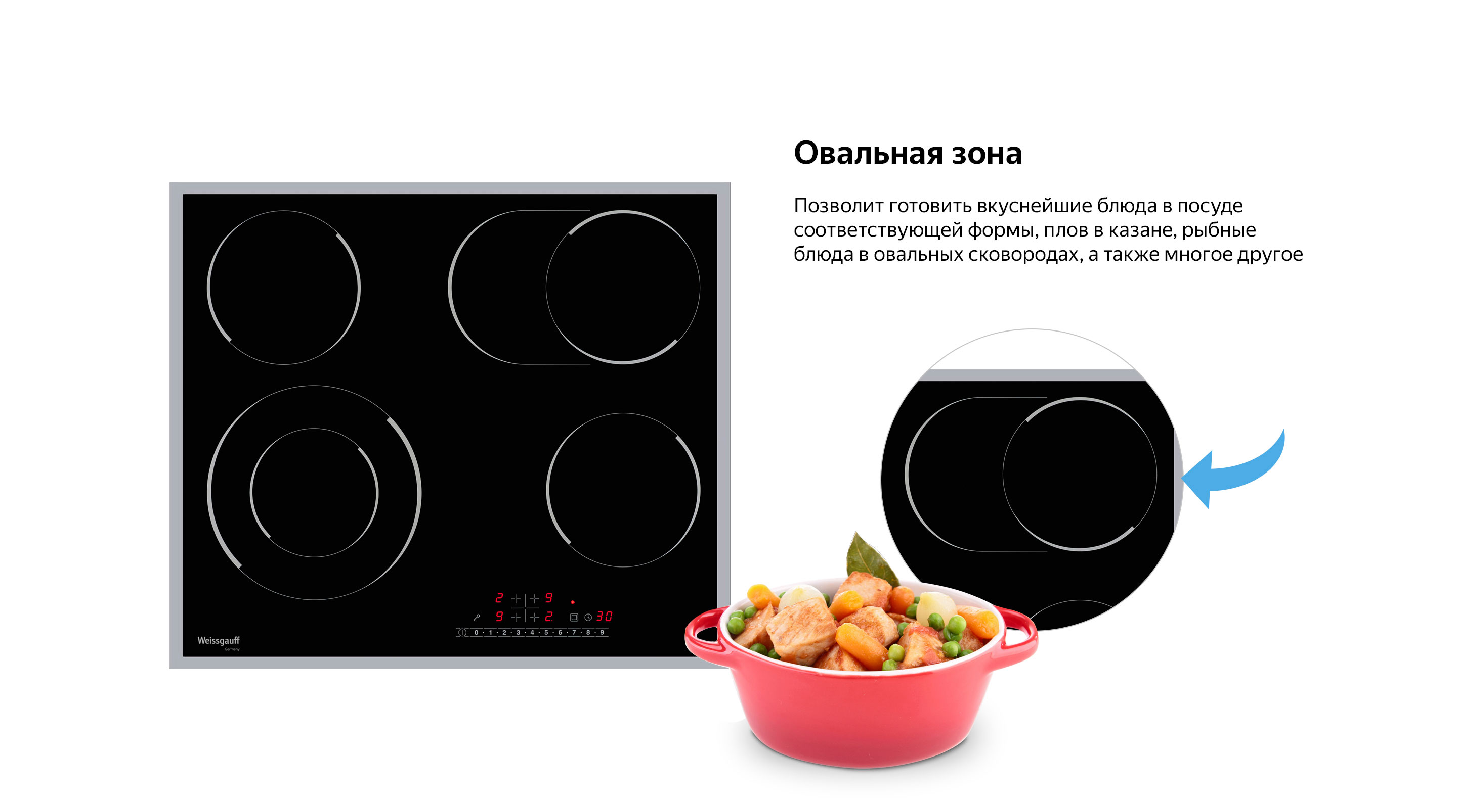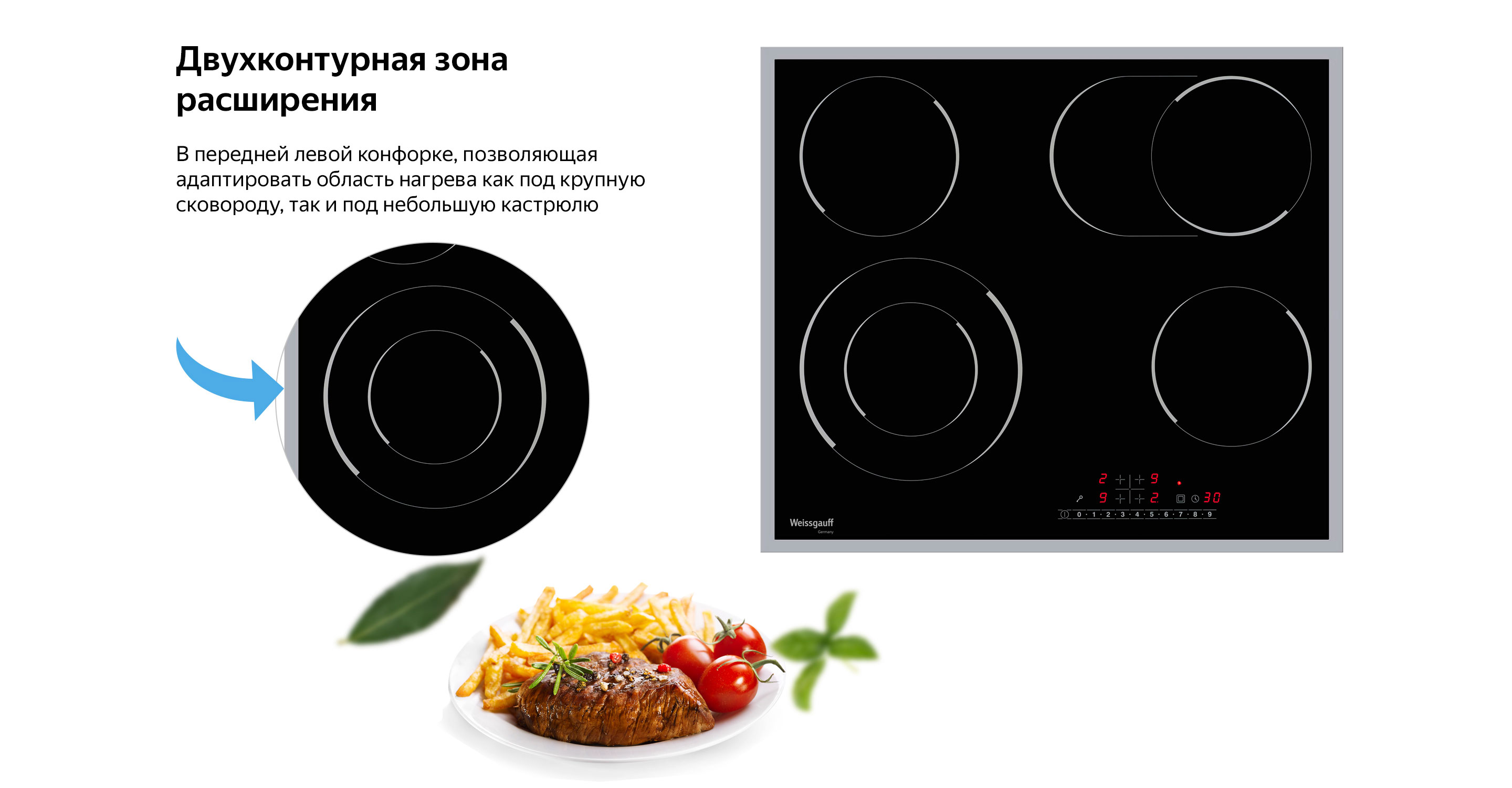 Стеклокерамическая панель с металлической рамкой, дополнительной овальной зоной и двухконтурной конфоркой сочетает в себе возможности приготовления в посуде разной формы и диаметра по более, чем доступной цене. Золотая середина варочных панелей Weissgauff.