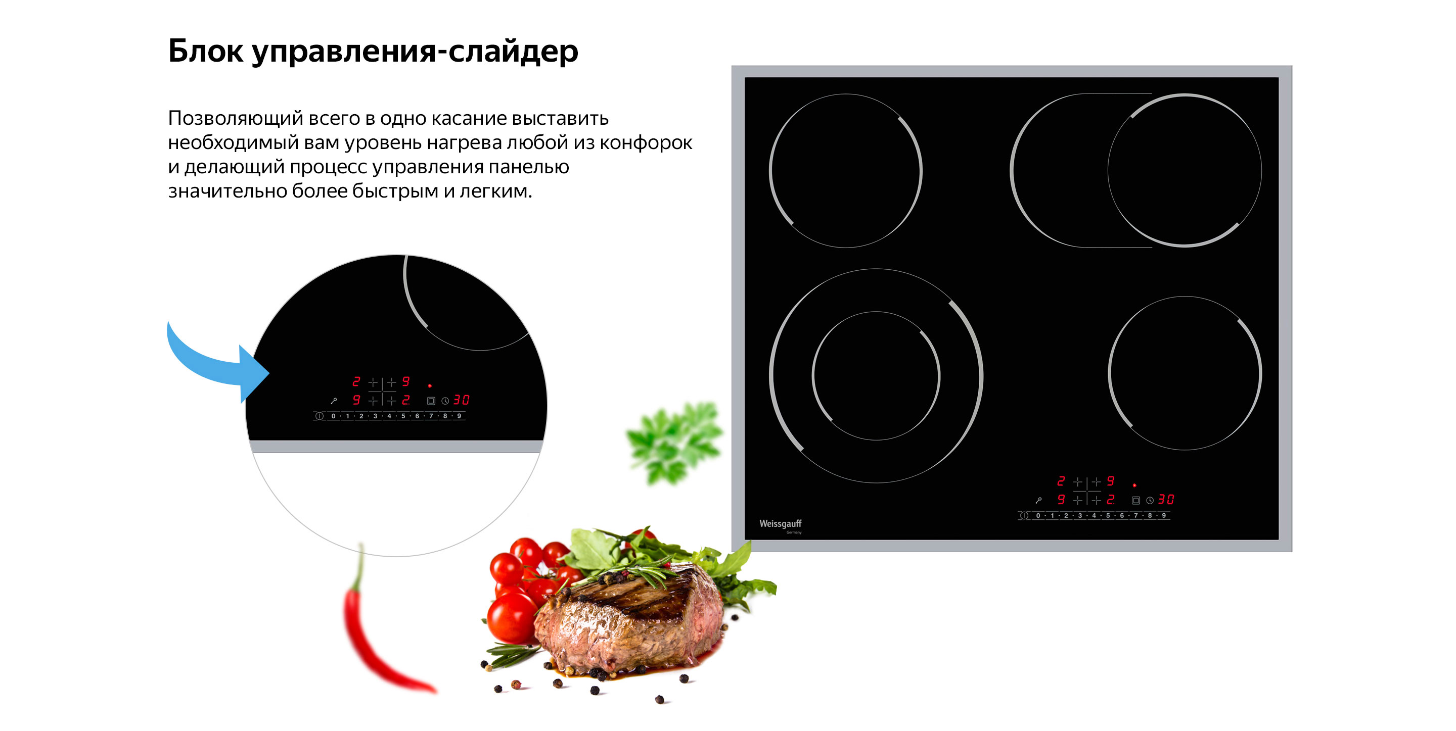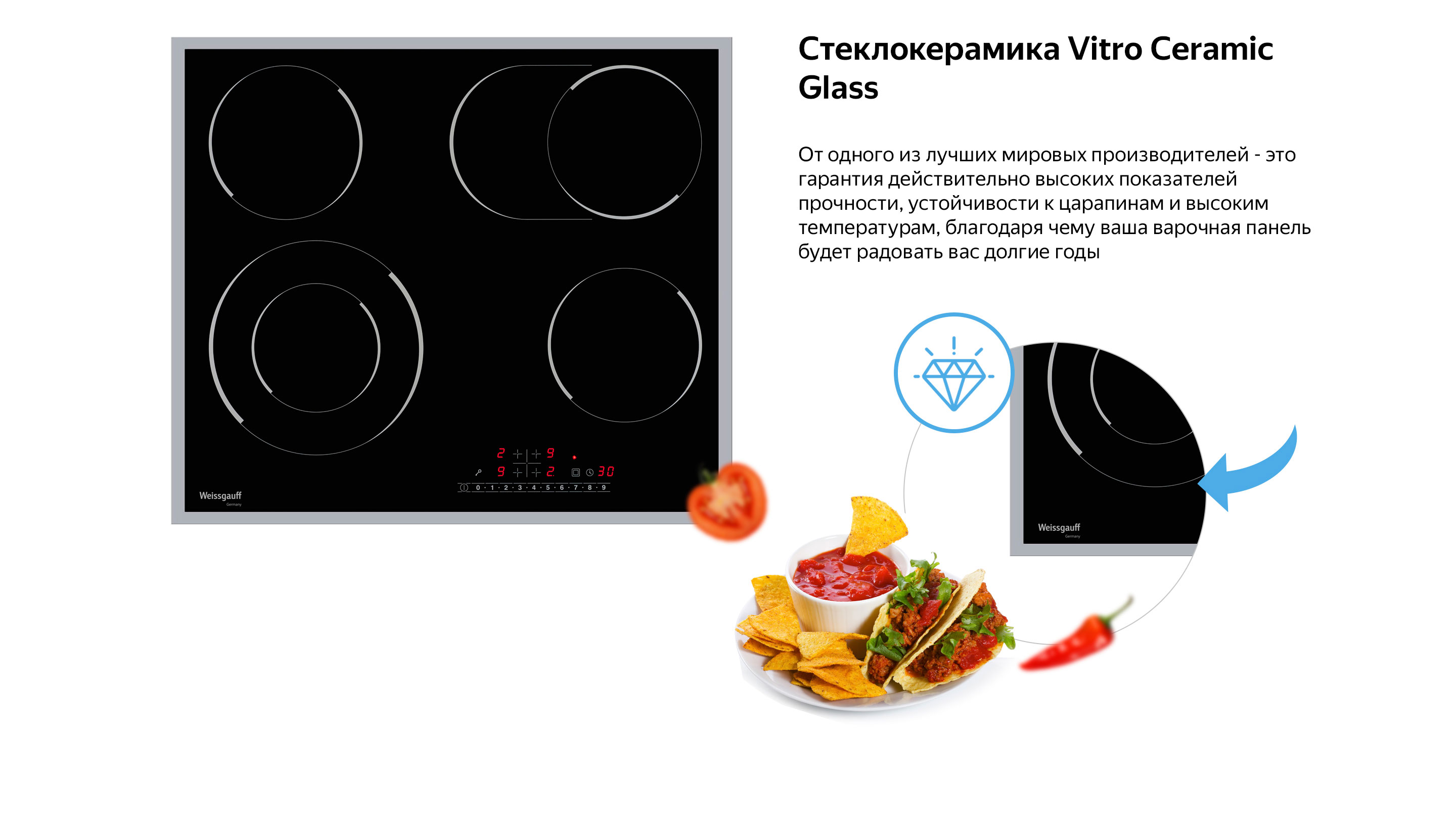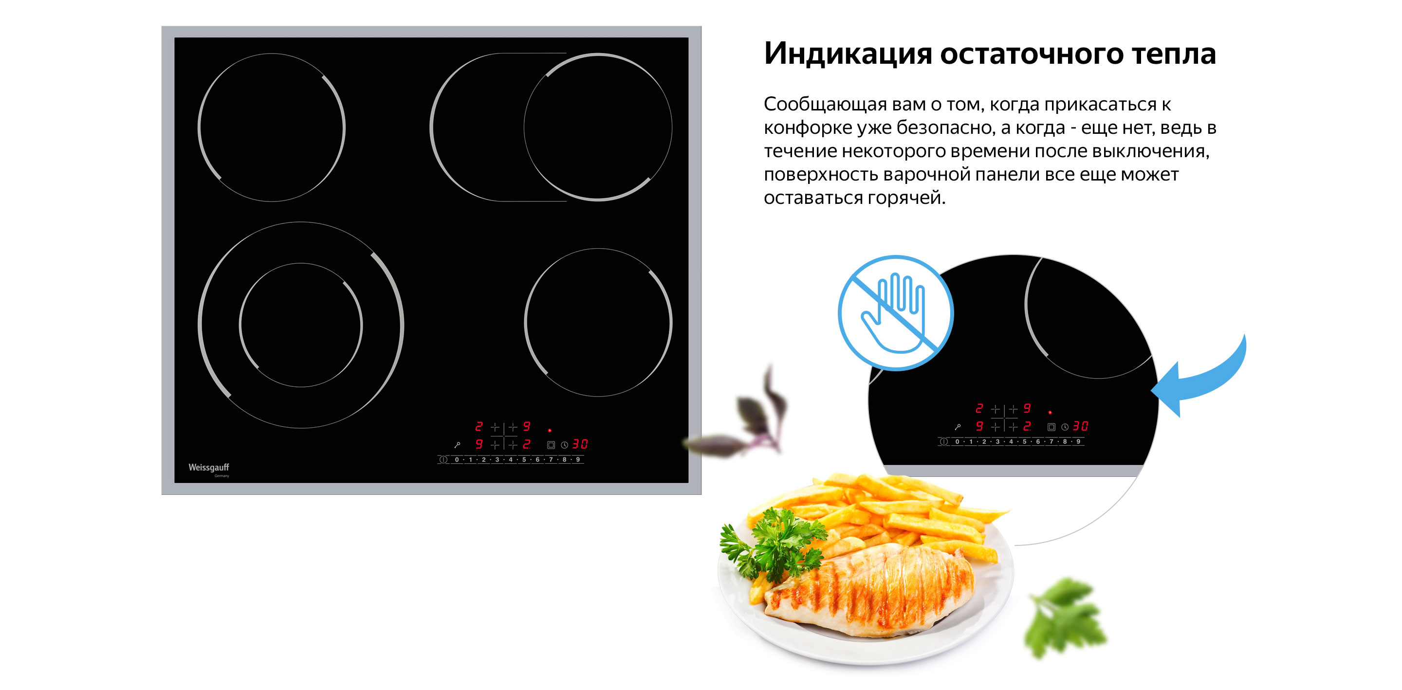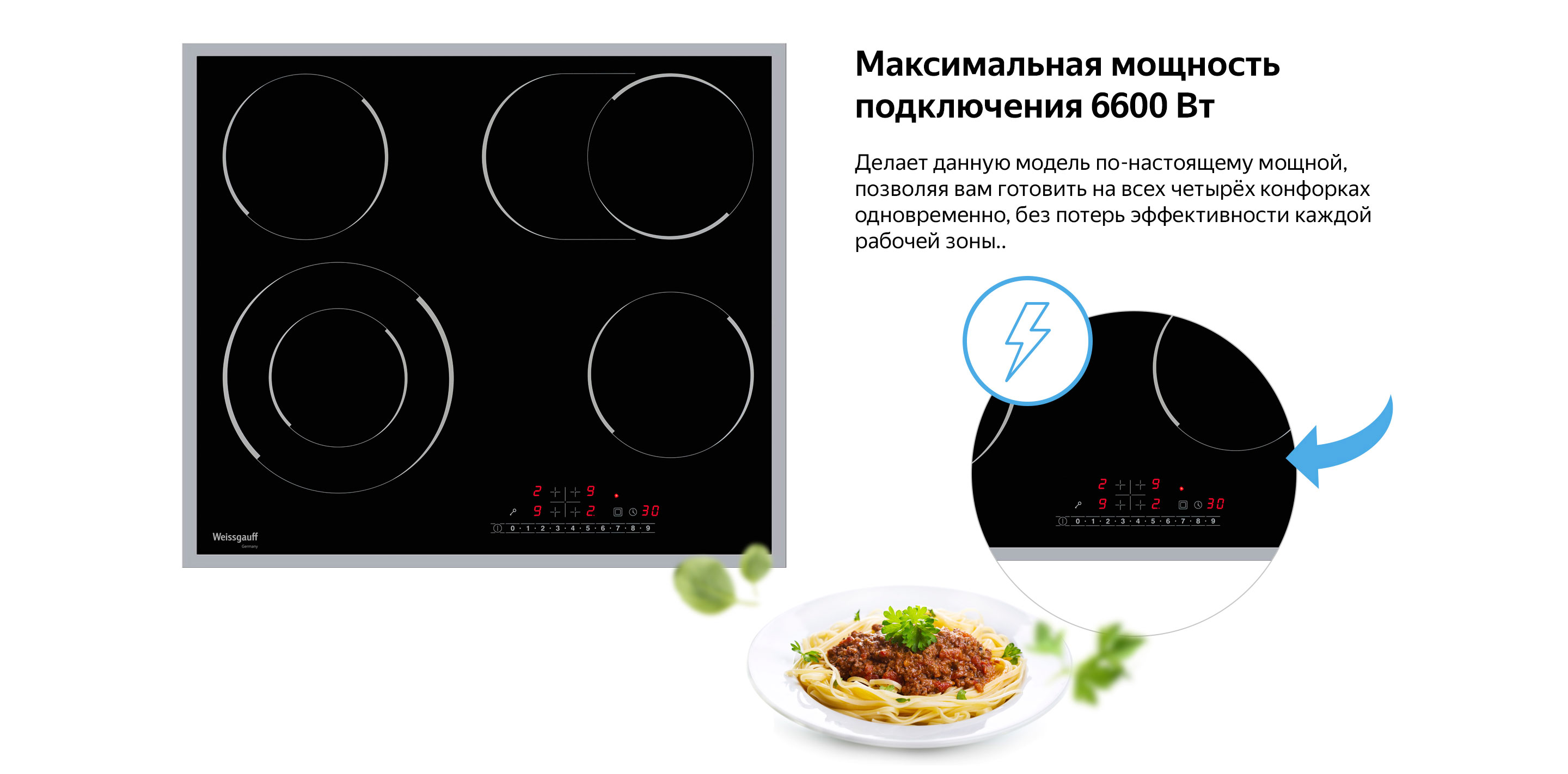 Стеклокерамическая панель с металлической рамкой, дополнительной овальной зоной и двухконтурной конфоркой сочетает в себе возможности приготовления в посуде разной формы и диаметра по более, чем доступной цене. Золотая середина варочных панелей Weissgauff.