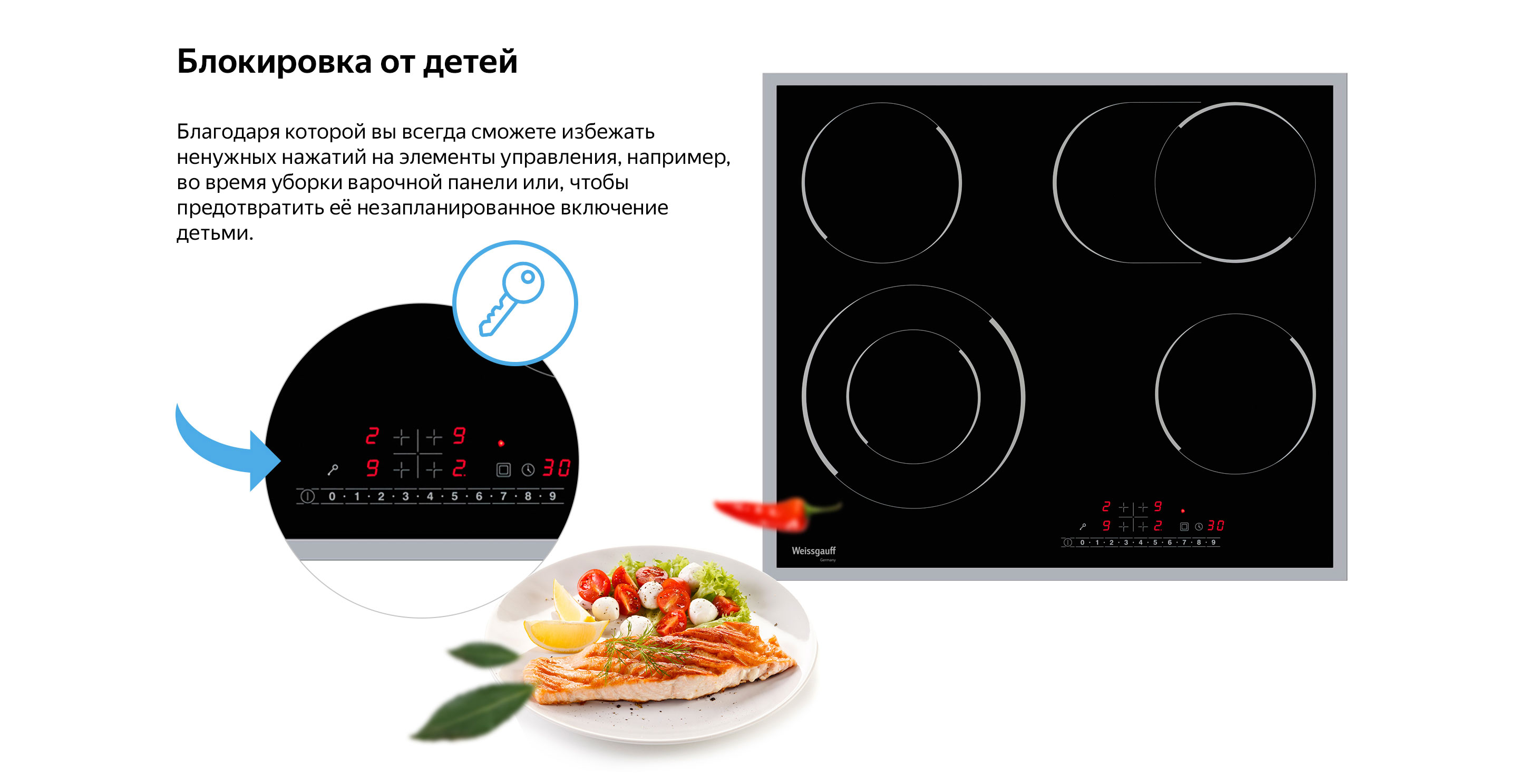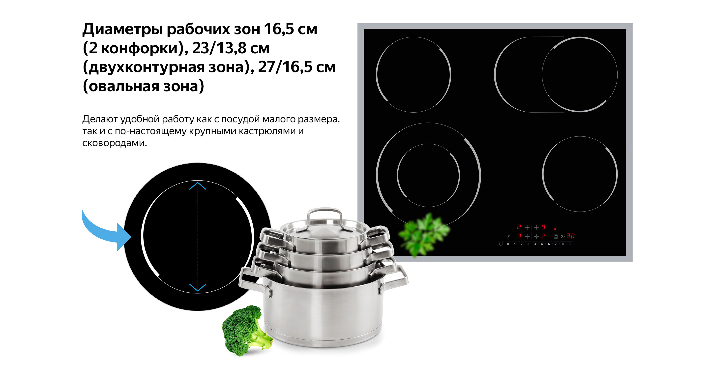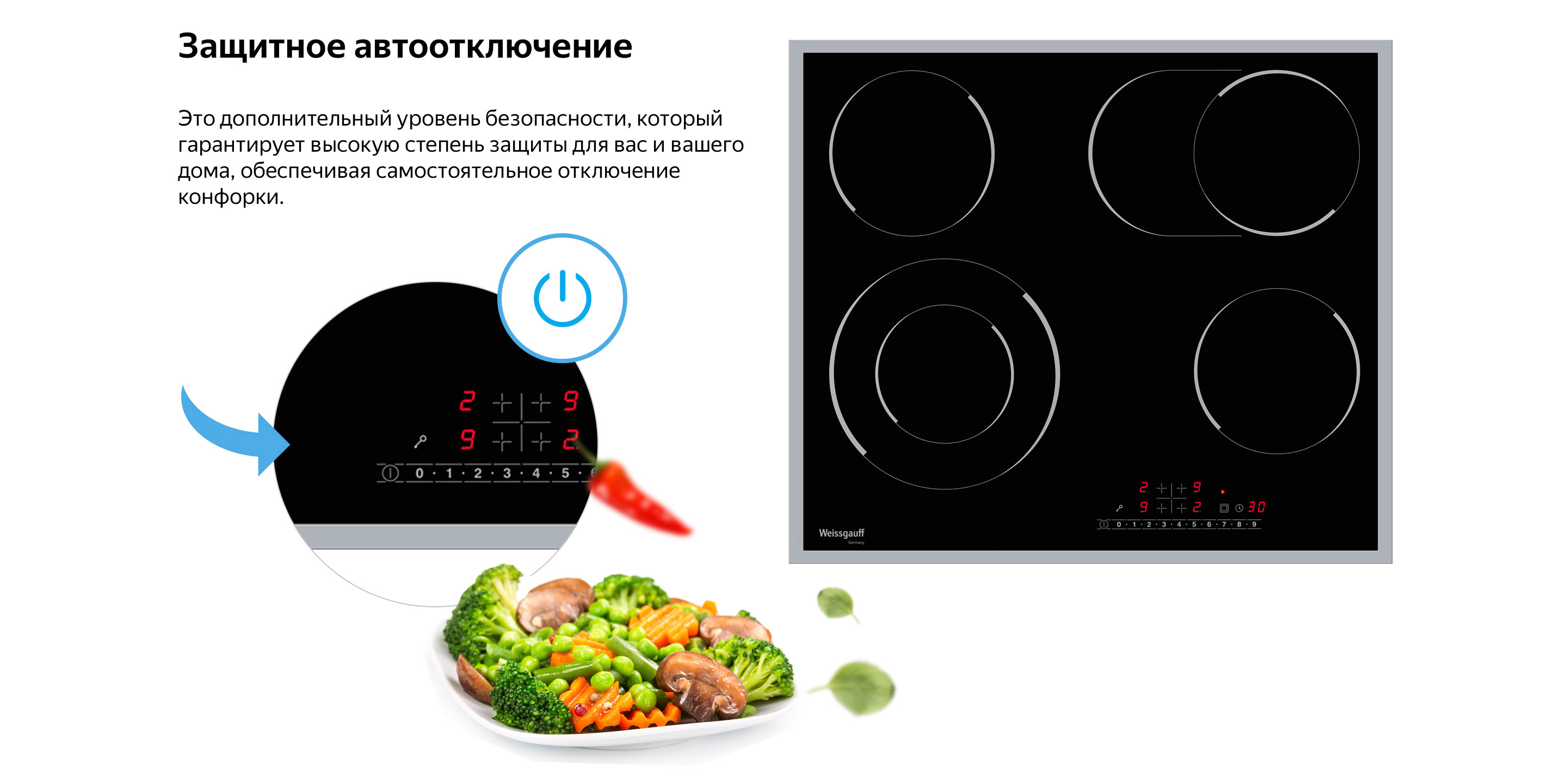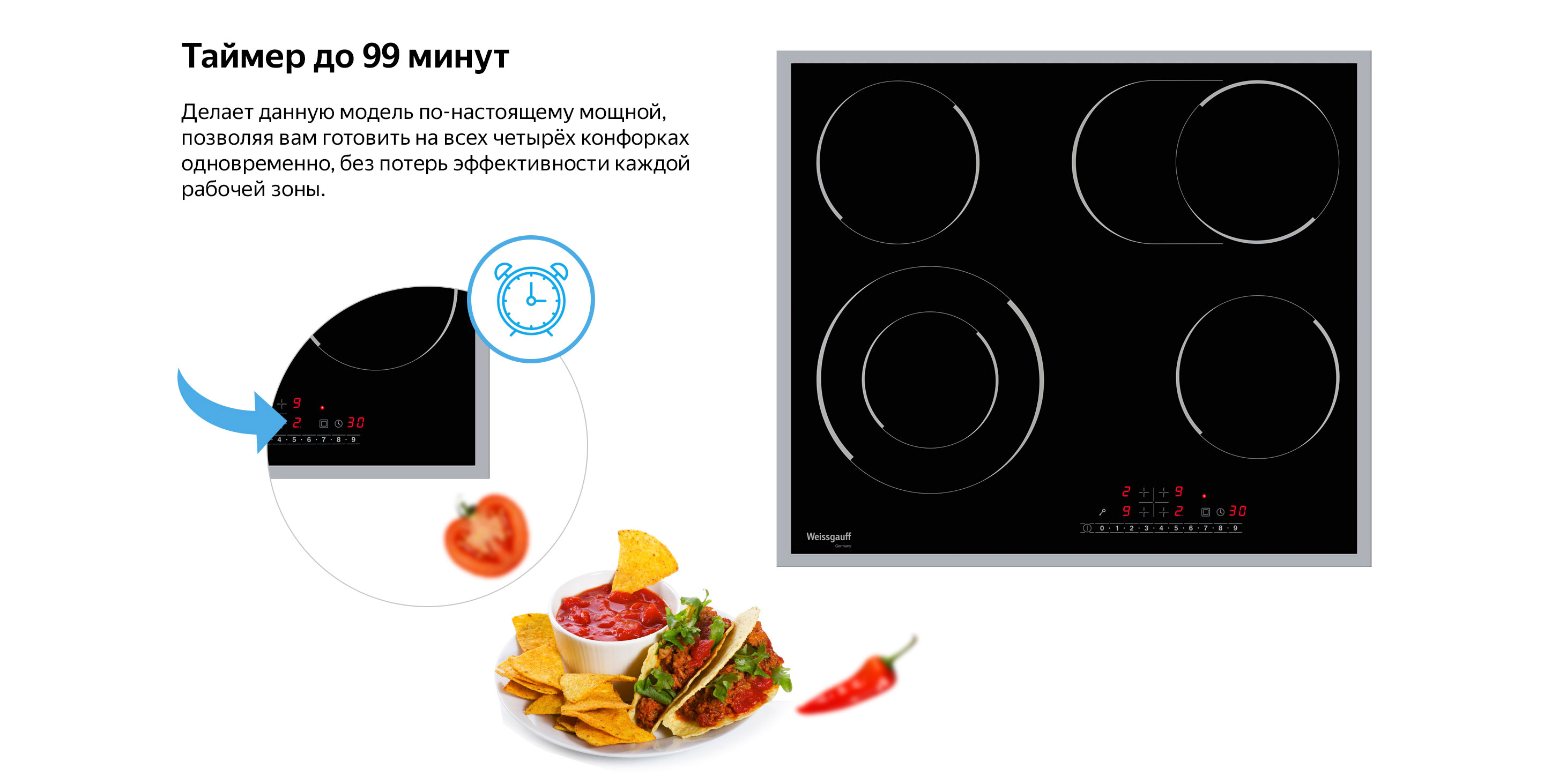 Стеклокерамическая панель с металлической рамкой, дополнительной овальной зоной и двухконтурной конфоркой сочетает в себе возможности приготовления в посуде разной формы и диаметра по более, чем доступной цене. Золотая середина варочных панелей Weissgauff.